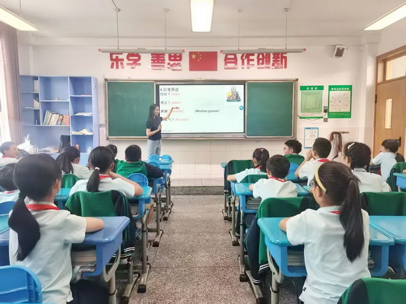 4.5班陈馨雅姐姐带领四年级五班的同学们学习西班牙语,同学们在一次次联系中掌握了一些基础的西班牙词汇,并了解西班牙丰富多彩的文化。