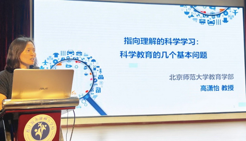 为深入贯彻落实国家教育强国战略,推进《关于加强新时代中小学科学教育工作的意见》落地见效,6月13日,都江堰市灌州小学特别邀请北京师范大学高潇怡教授走进校园,为全体教师带来一场题为《指向理解的科学学习:科学教育的几个基本问题》的专题讲座。本次活动以“提升科学教育质量,赋能教师专业成长”为目标,为老师们打开了科学教育的新视野。