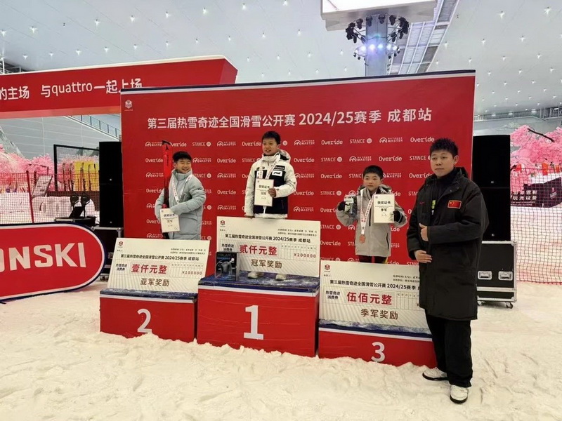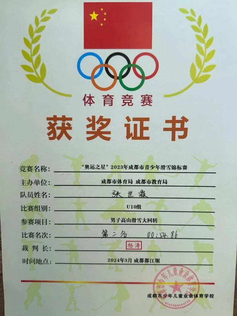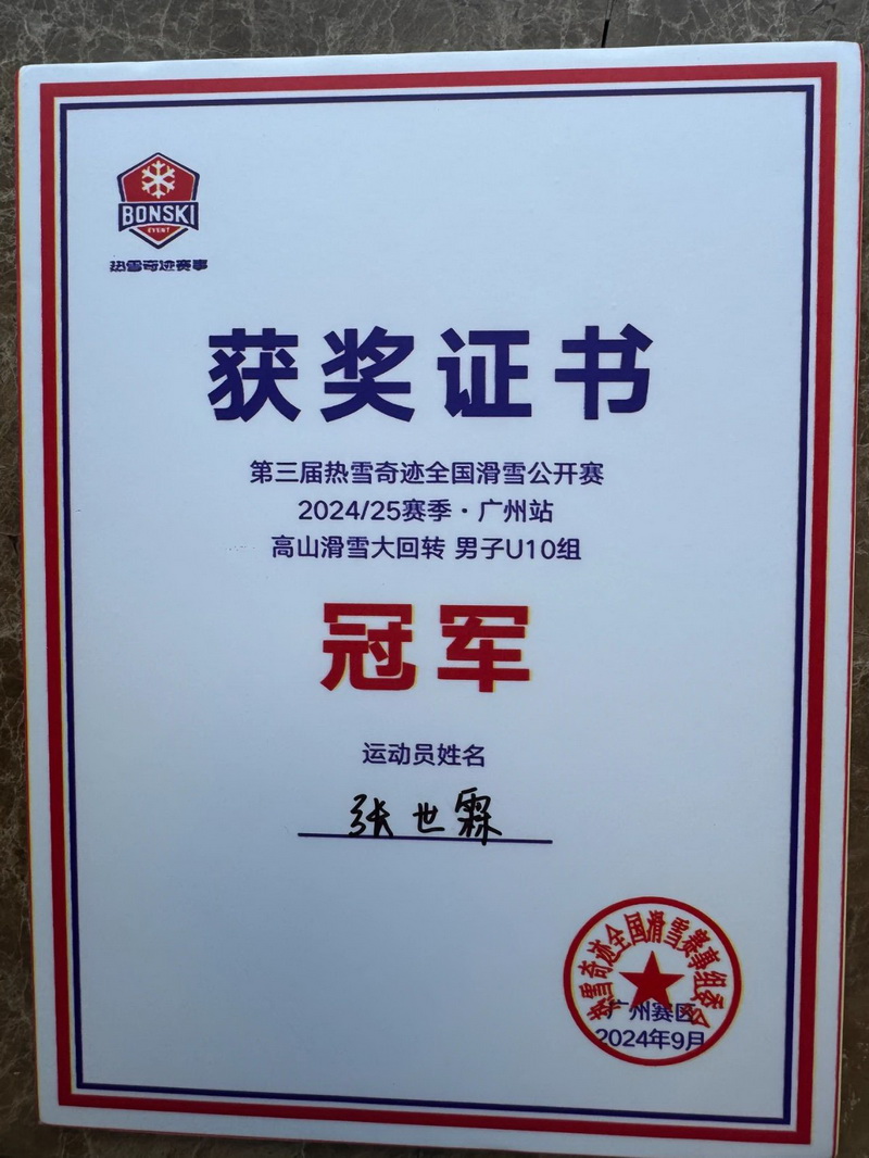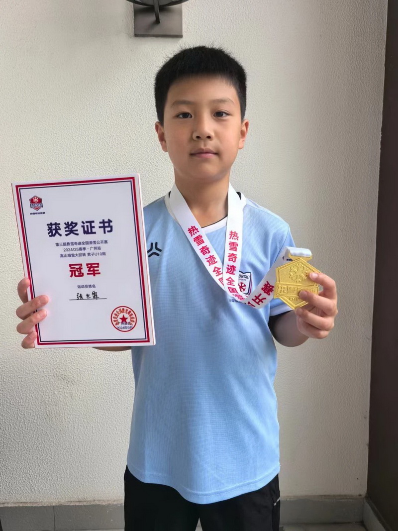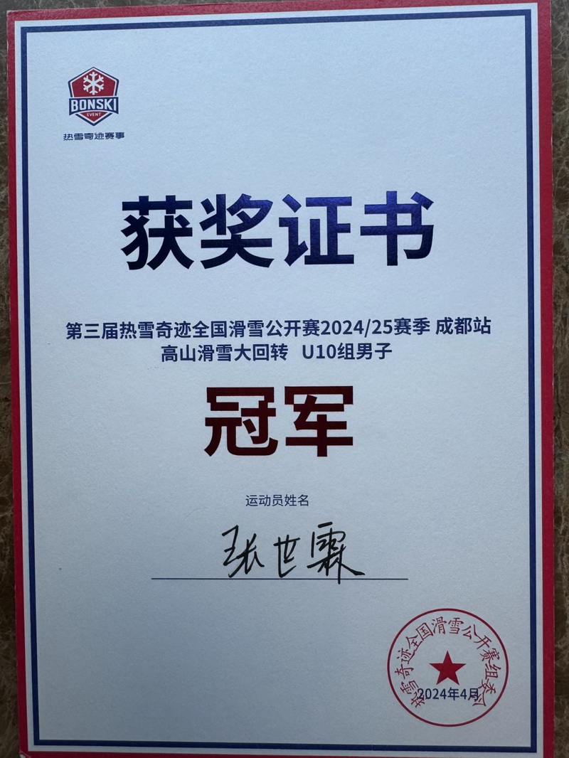第三届热雪奇迹全国滑雪公开赛成都站、广州站U10组高山滑雪大回转双冠军;
