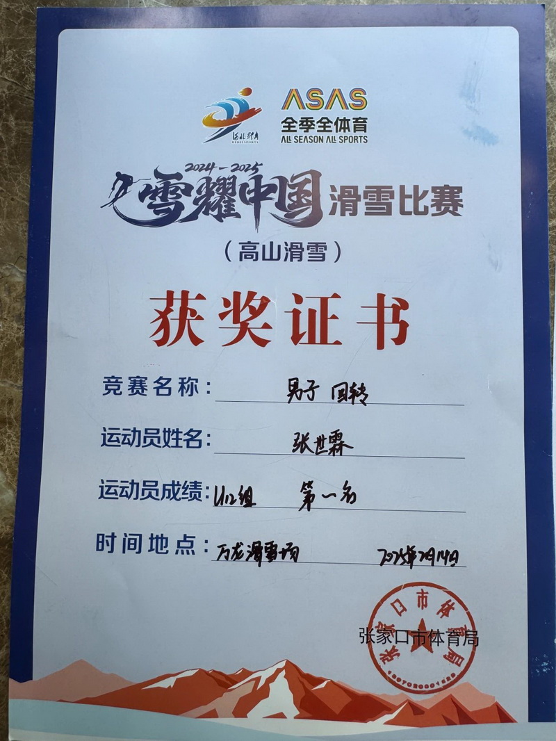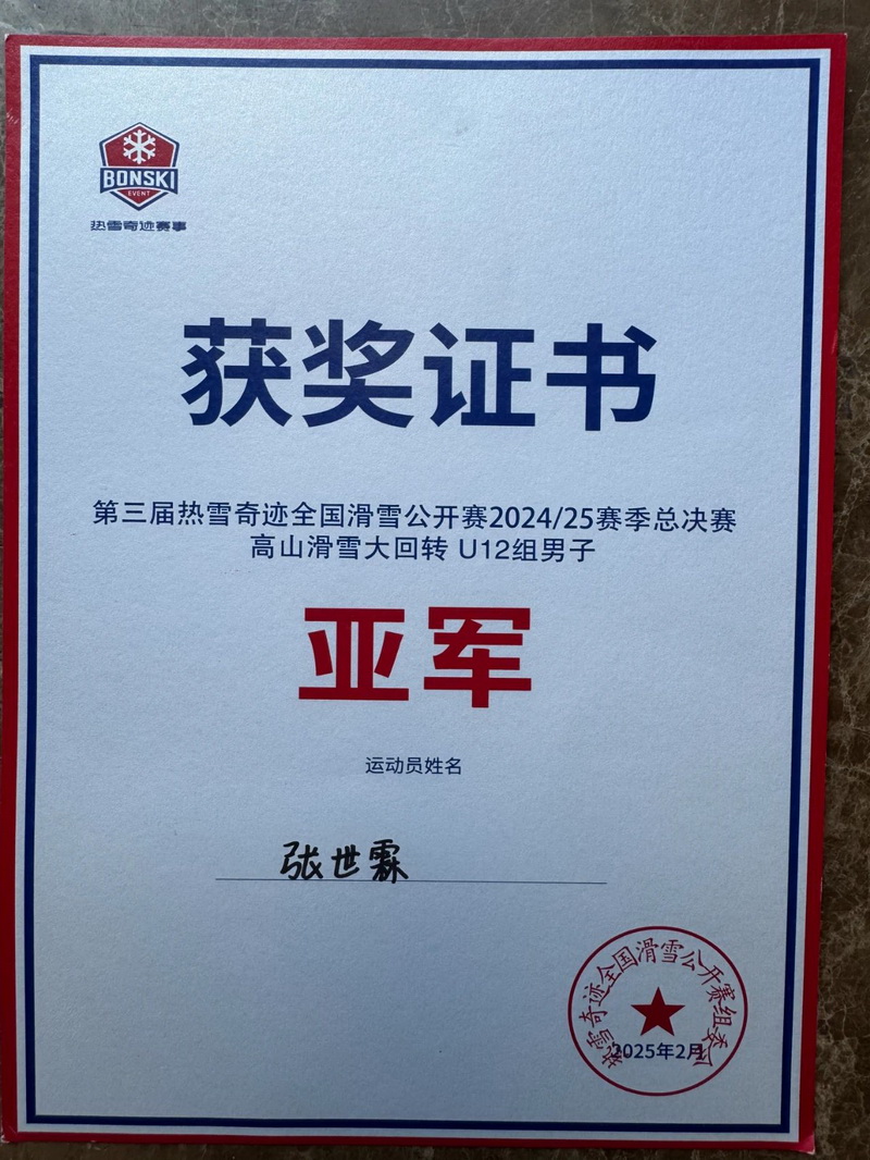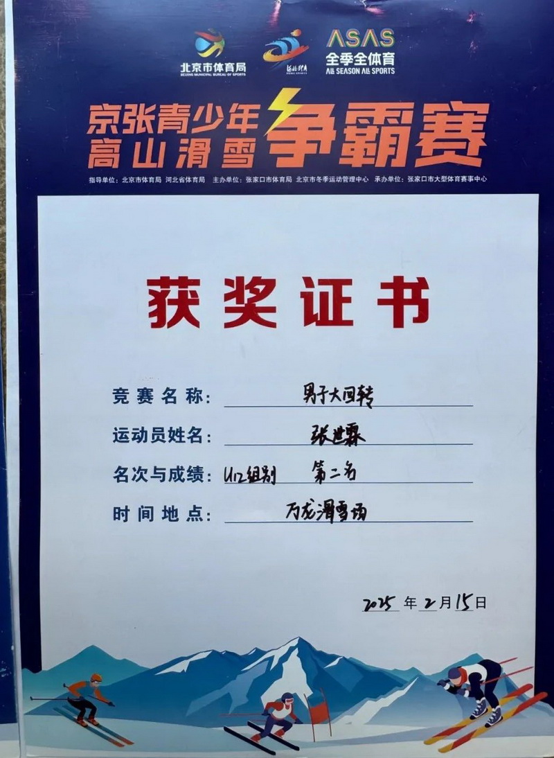 京张青少年高山滑雪争霸赛男子大回转U12组亚军。