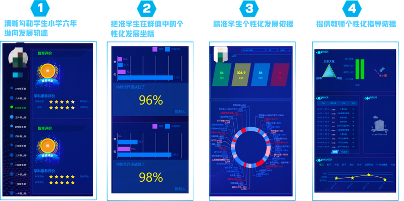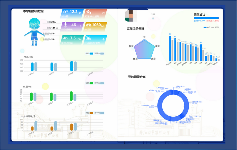 基于六年纵向数据,生成学生个体成长轨迹图,标注其在群体中的发展坐标。融合显性(成绩、活动)与隐性(兴趣倾向、抗挫力)因素,动态呈现“五育并举”发展图谱。