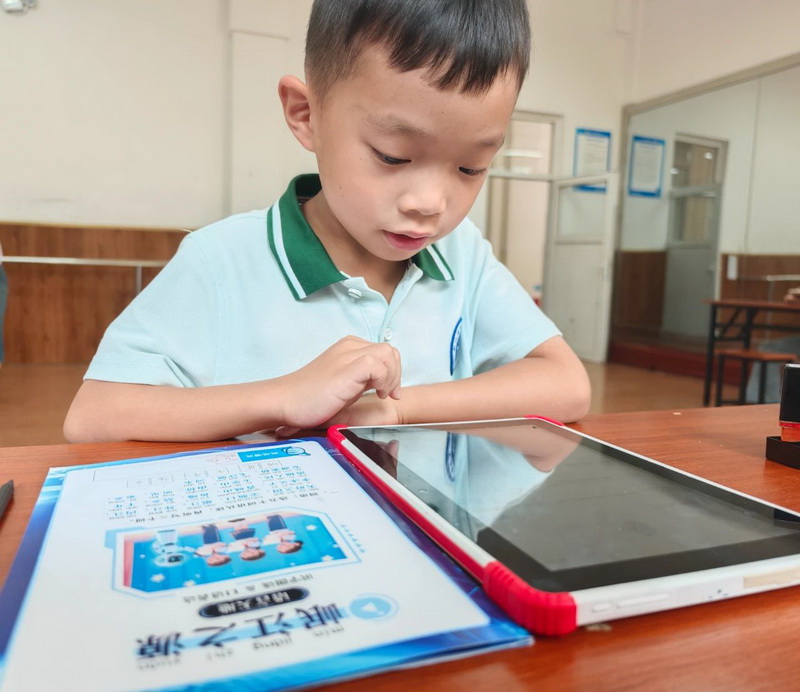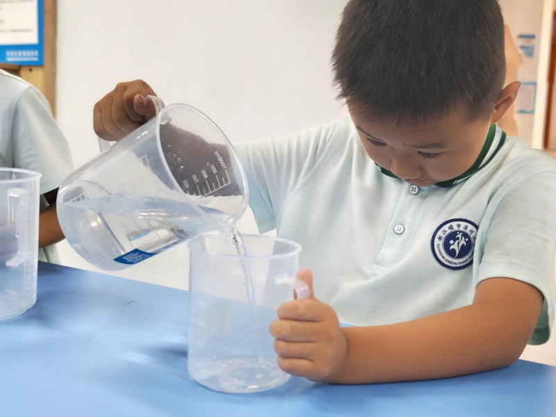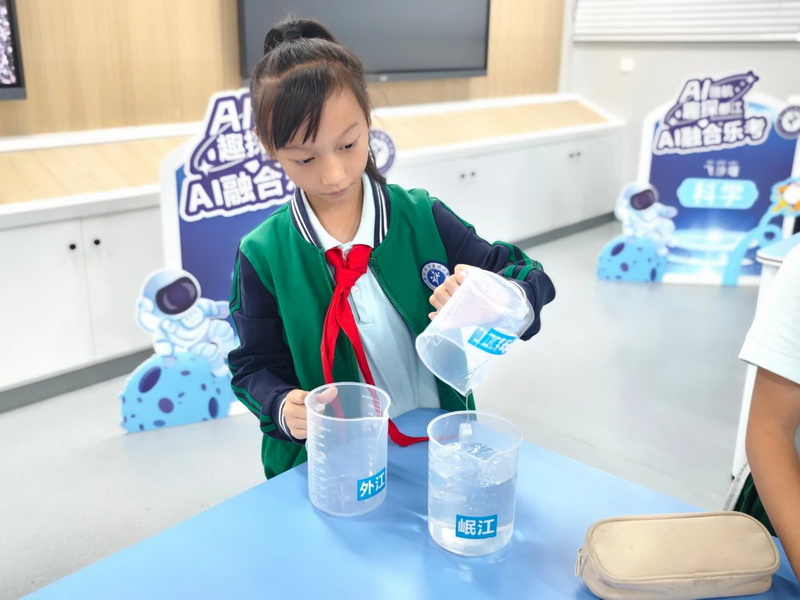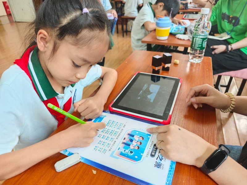 In the "Water Flow Mental Arithmetic" zone, the kids, like young hydrologists, raced to solve arithmetic problems, with the Doubao Intelligent Agent Mini Program judging results in seconds. At "Water Distribution Steward," they picked up rulers to carefully measure the length of "water distribution models" and compare the capacities of different containers. Math was no longer just numbers on paper—it became a practical skill for solving "water distribution puzzles"!