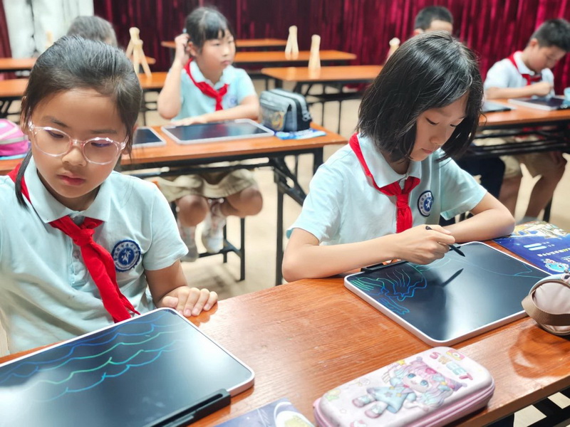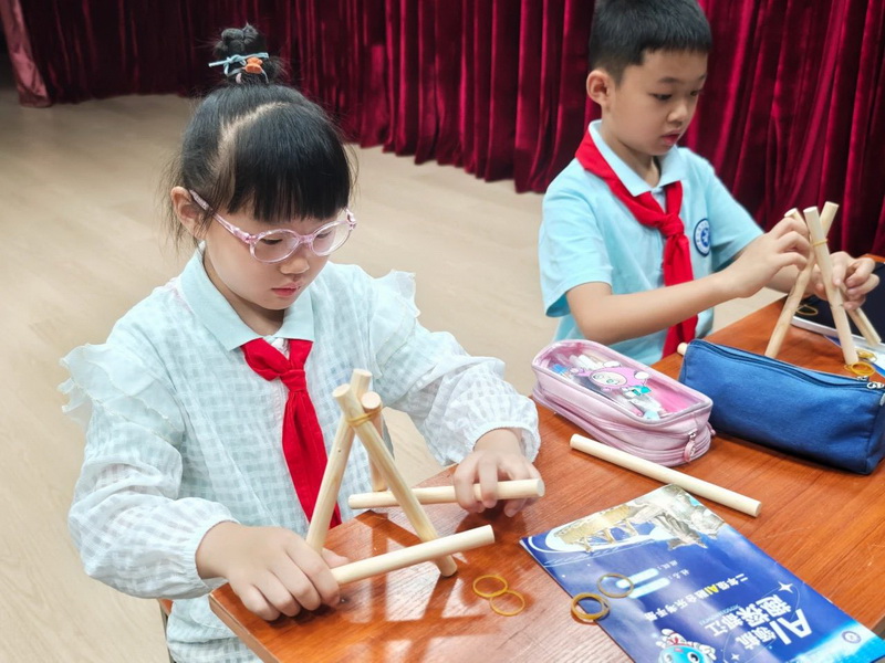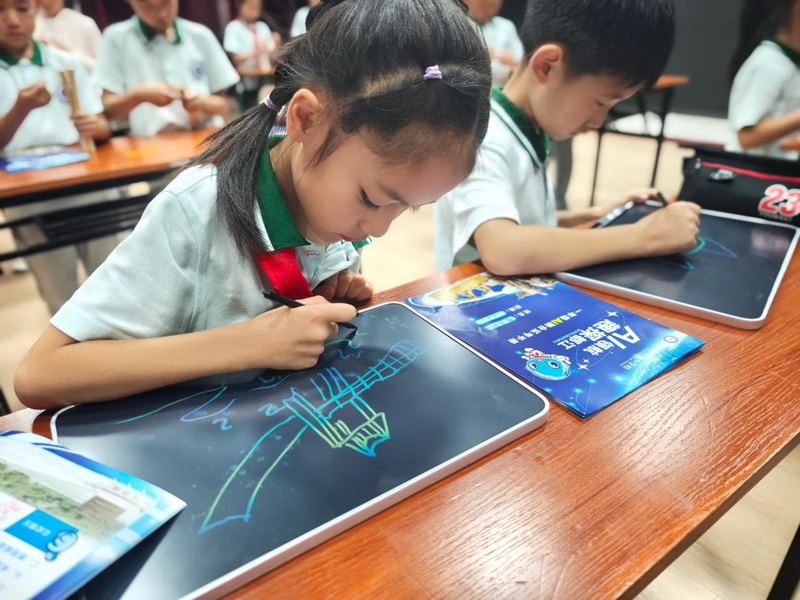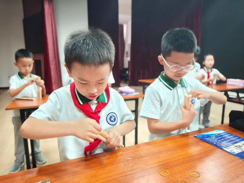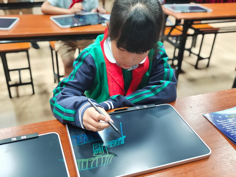 Bamboo strips twisted under tiny hands as "Skillful Bamboo Cage Weavers" recreated the wisdom of ancient weir water control. Landscape paintings took shape with the help of drawing apps, and AI animation generation brought the Min River in their sketches to "life."