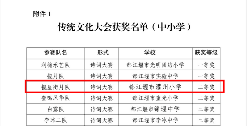 近日,都江堰市教育局发布《关于2025年中小学优秀传统文化大会先进单位和个人的通报》 ,灌州小学在以“蜀风诗韵”为主题的盛会中表现亮眼,斩获多项荣誉。