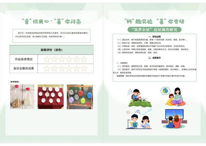 科学实验、房屋模型研究等任务,引导学生在探究中发展创新能力,优秀作品将推荐参加科技节。