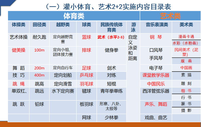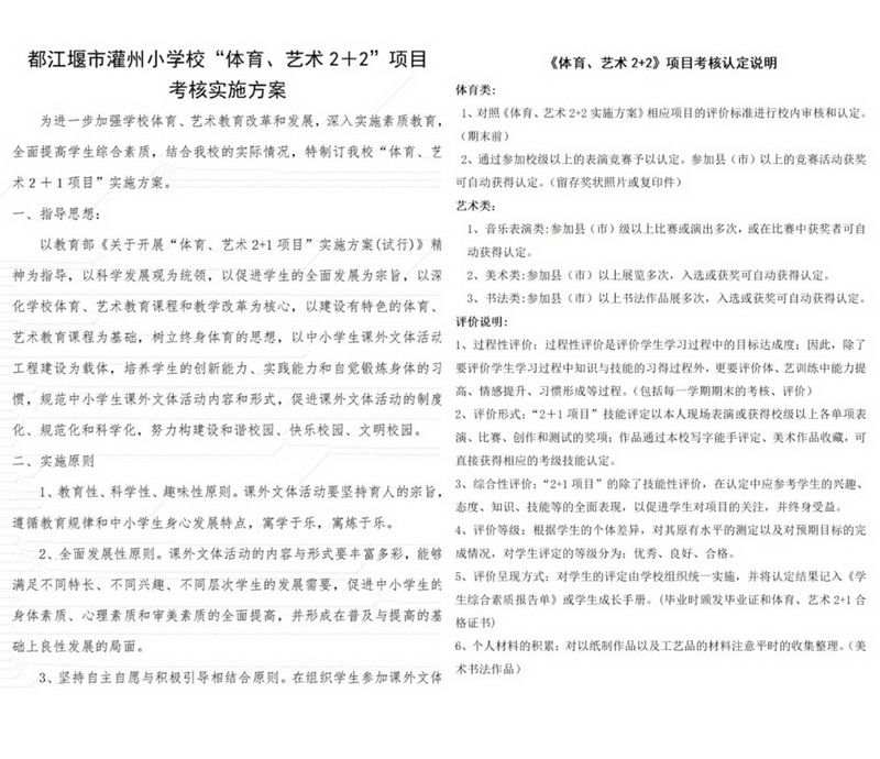 为深入落实“双减”政策,深化“五育并举”的素质教育实践,推动学校体育与艺术教育的 高质量发展 ,鼓励学生全面发展,灌州小学以教育部《关于开展“体育、艺术2+1项目”实施方案(试行)》为指导,结合本校实际,精心制定“灌州小学体育、艺术2+2项目”实施方案及细则,着力构建特色鲜明的体艺兴趣课程体系。