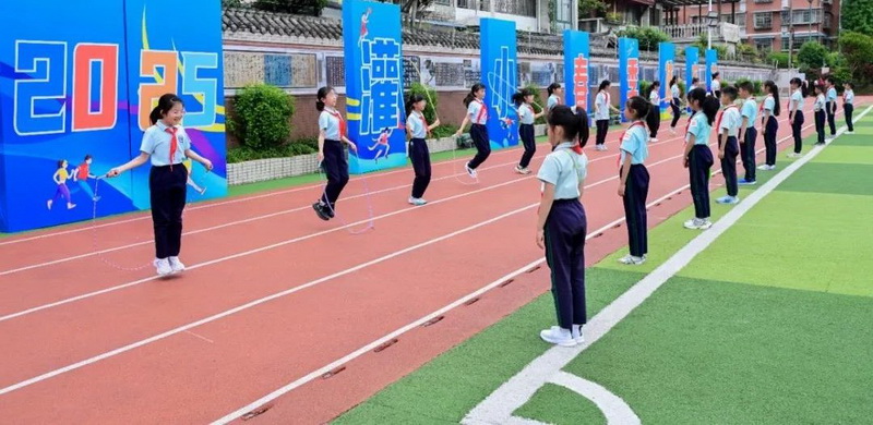 跳绳必修:要求全体学生熟练掌握跳绳基本技能,并在此基础上开展花样跳绳训练。大课间活动中,全校推广跳绳一级规定动作的学练,形成浓郁的运动氛围。