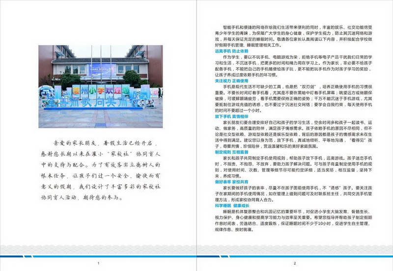 灌州小学2025年的暑假,不再仅仅是休憩的时光,更是家校社协同发力、精心设计的育人“有为期”。《暑假家校社协同育人活动手册》是学校递交给广大家庭和社区的一份“育人邀请函”。我们期待每一位家长成为孩子假期成长的“首席导师”,每一个社区角落成为孩子实践锻炼的“第二课堂”。让我们携手并肩,共同守护孩子们的安全,丰富他们的体验,启迪他们的智慧,滋养他们的心灵,让这个暑假成为孩子们成长道路上收获满满、闪闪发光的一段美好旅程!