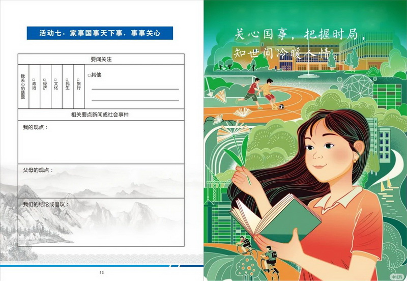 8.“胸怀天下”视野拓展:引导学生关注新闻热点并与父母交流观点,培养家国情怀、批判思维和社会洞察力。