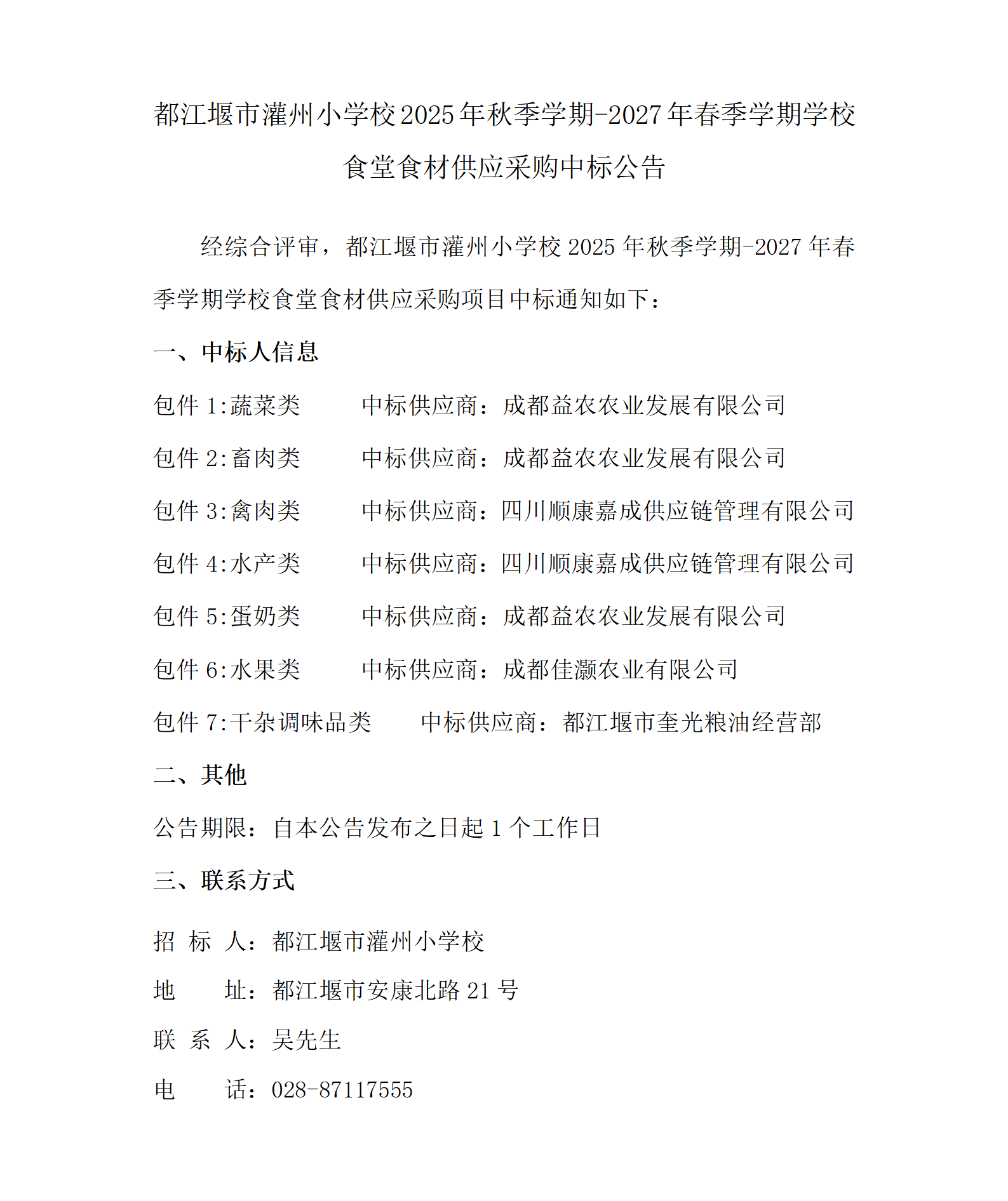 都江堰市灌州小学校2025年秋季学期-2027年春季学期学校食堂食材供应采购中标公告