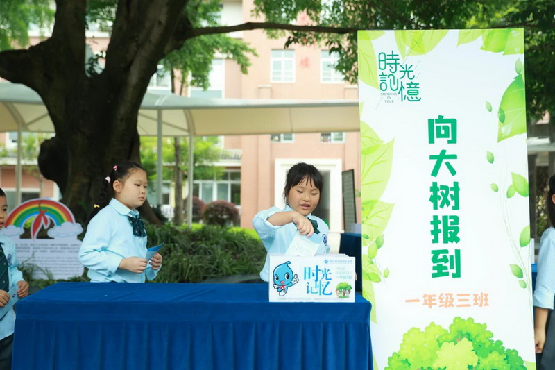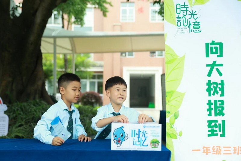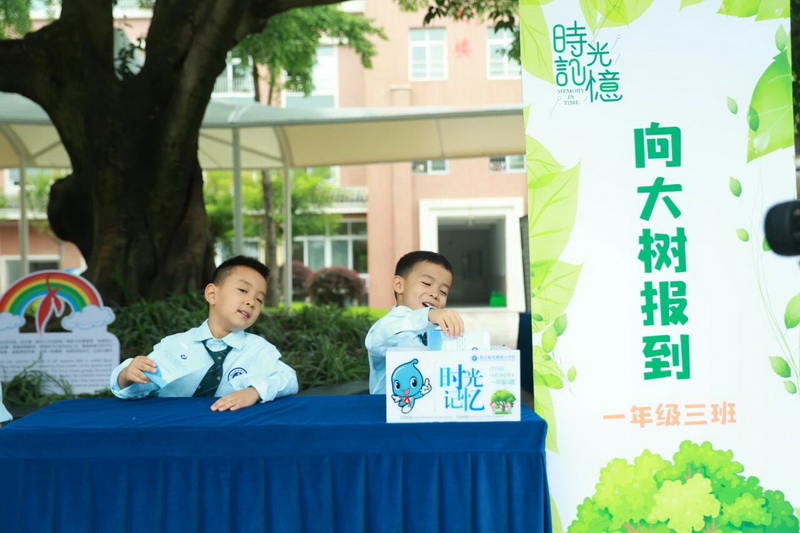 开学典礼后,一年级新生们手持写有名字的心愿卡,在老师带领下参加“大树报到”仪式。孩子们将自己的时光记忆卡投递到时光记忆盒中,那一张张卡片,承载着他们纯真的梦想和对未来的美好憧憬。