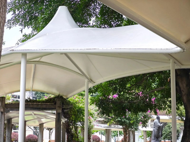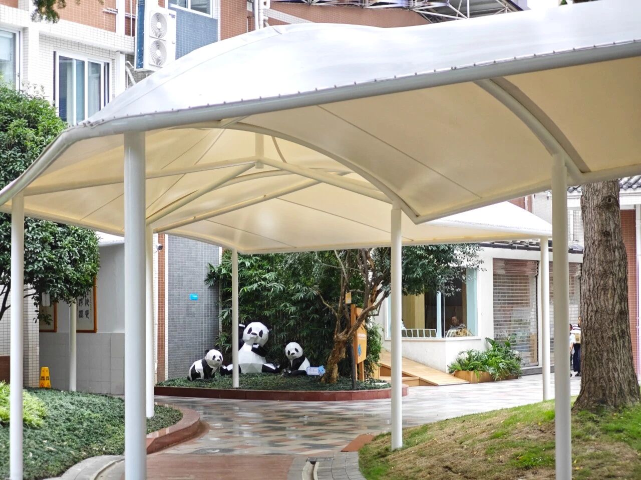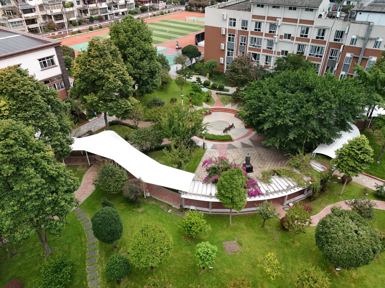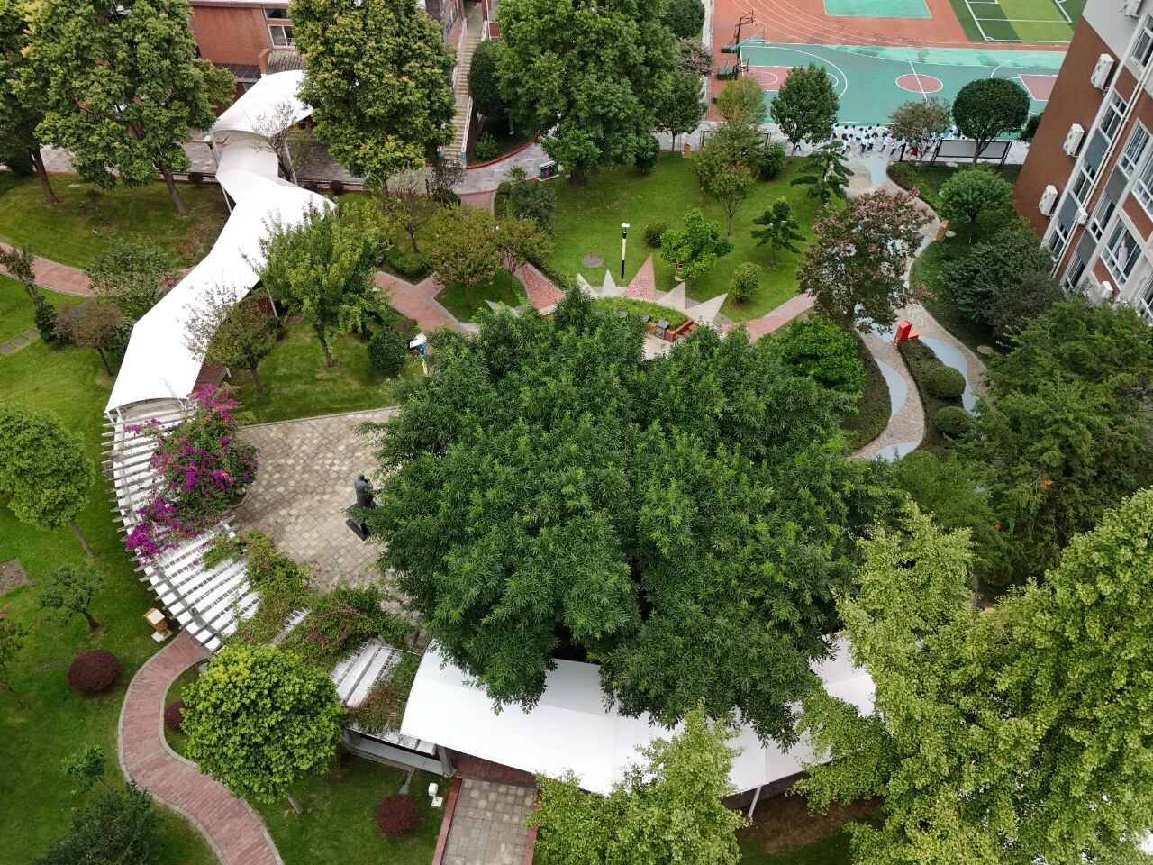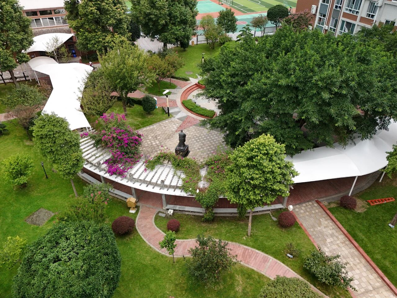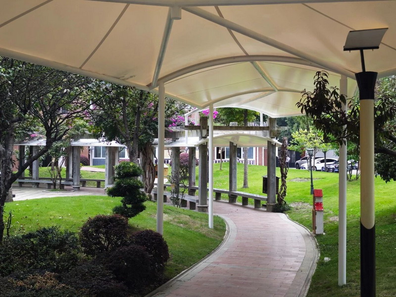 "No more umbrellas in the rain!"—the newly built winding weatherproof corridor amidst greenery is the first gift to students, shielding them from sun and rain.