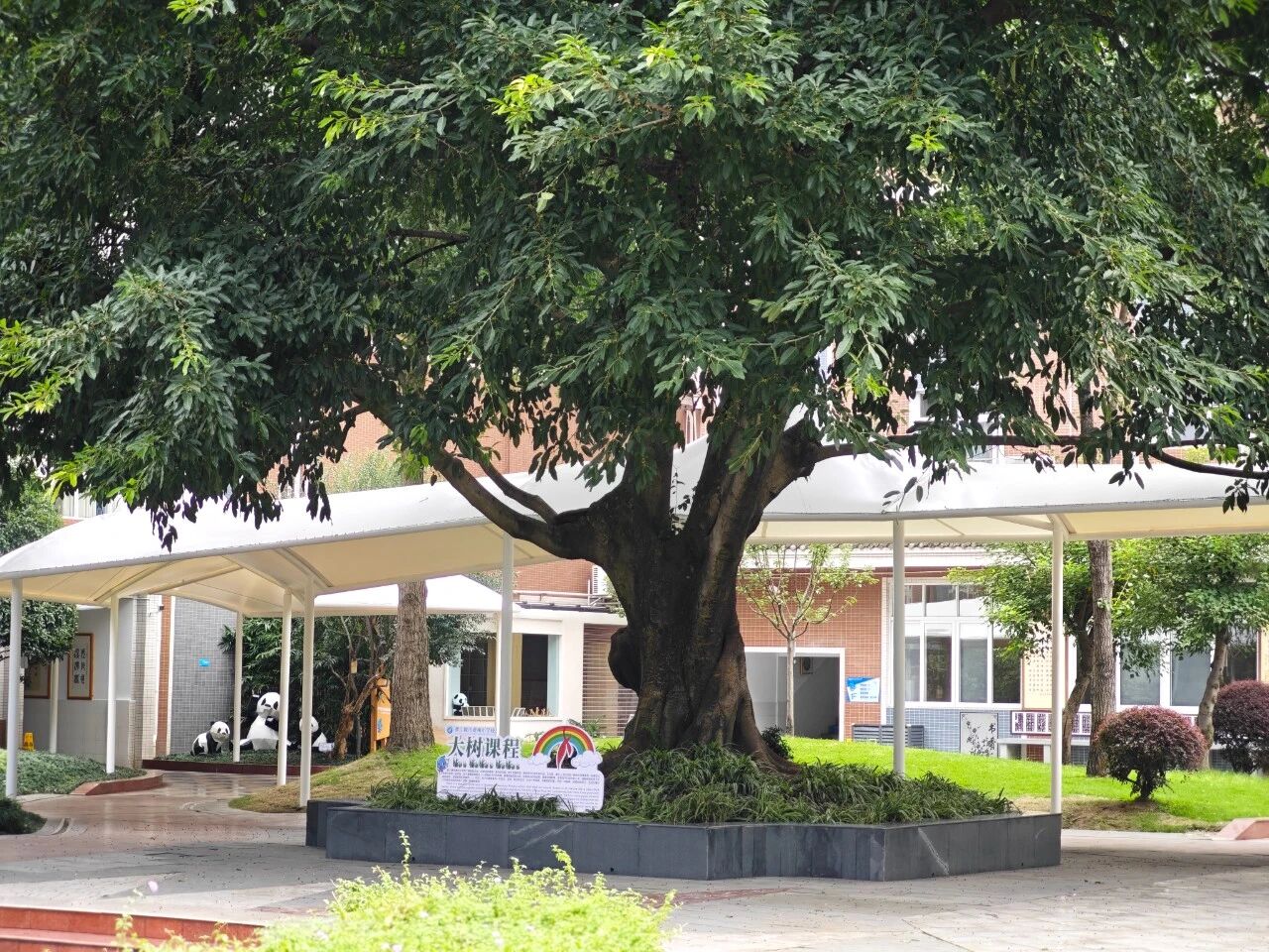 “下雨再也不用撑伞啦!”——这是后花园新建成的风雨长廊,给孩子们的第一份礼物!蜿蜒的长廊在绿植间,为孩子们遮阳挡雨,从教学区域到餐厅,从餐厅到宿舍,孩子们再也不用担心下雨天。