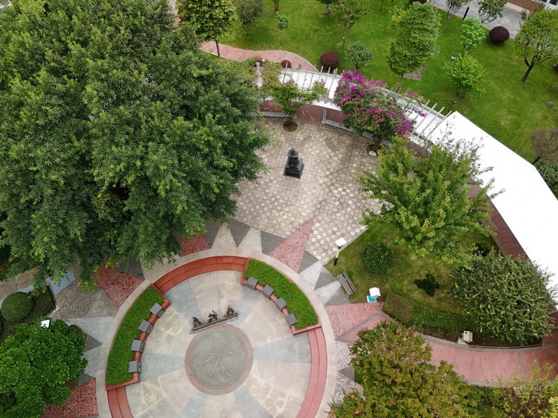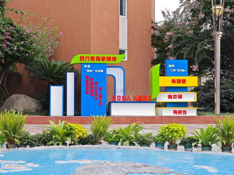 A striking new sculpture greets visitors at the entrance—framed by the Chinese characters "师 (teacher)" and "生 (student)" with a book-shaped base.