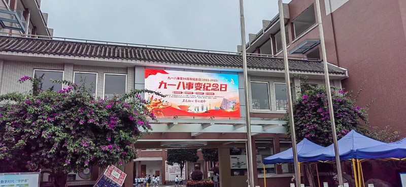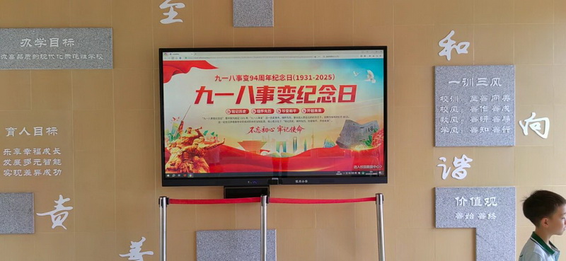 校园内的电子大屏、宣传栏全天滚动播放“九一八”主题海报、历史照片及爱国标语,如“勿忘国耻,警钟长鸣”“铭记历史,珍爱和平”等。让师生在耳濡目染中感受历史的厚重,将爱国情怀融入日常学习与生活。
