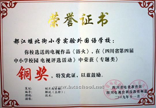 经过一个多月的资料收集、整理和创作,我校选送的专题片《浴火》获得四川省第四届中小学校园电视台节目评选铜奖。