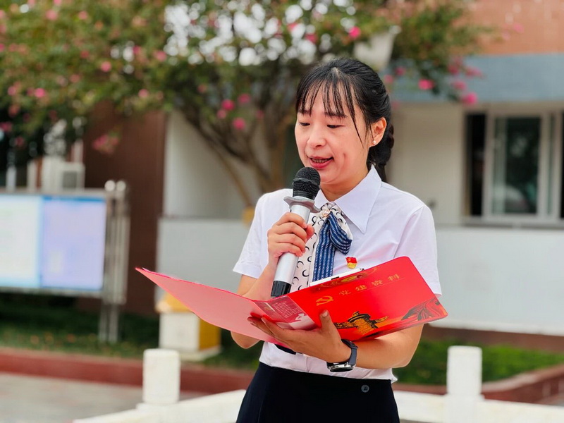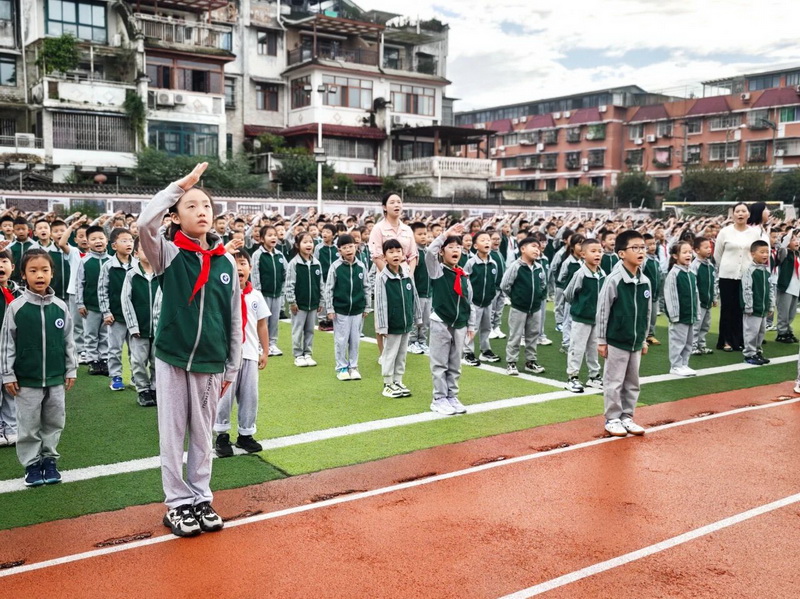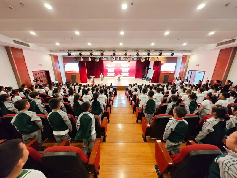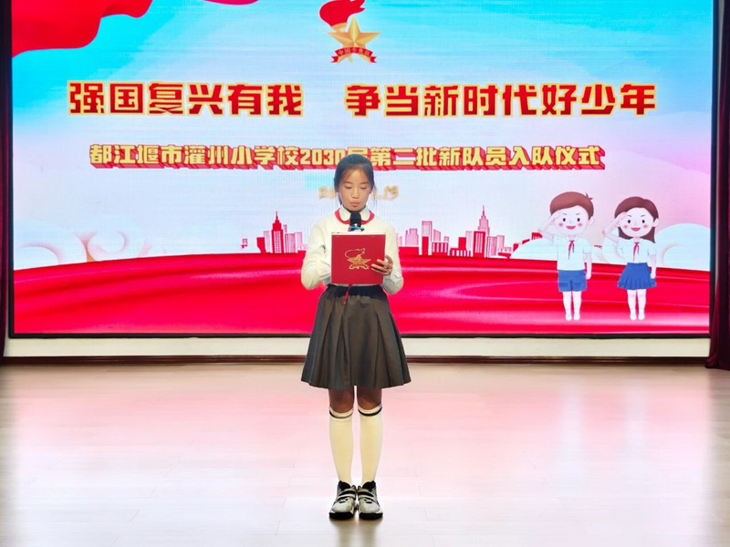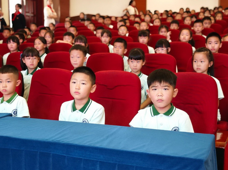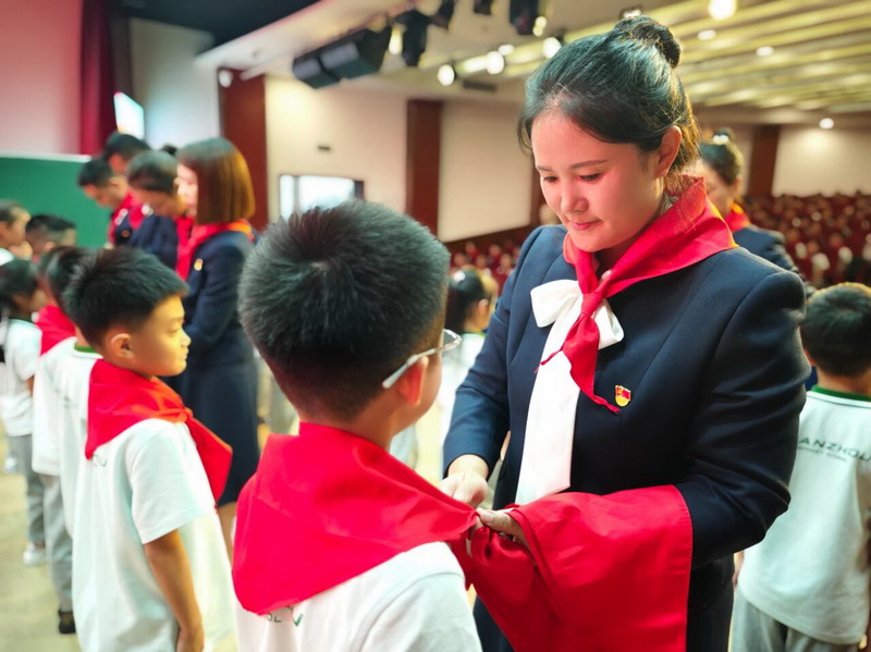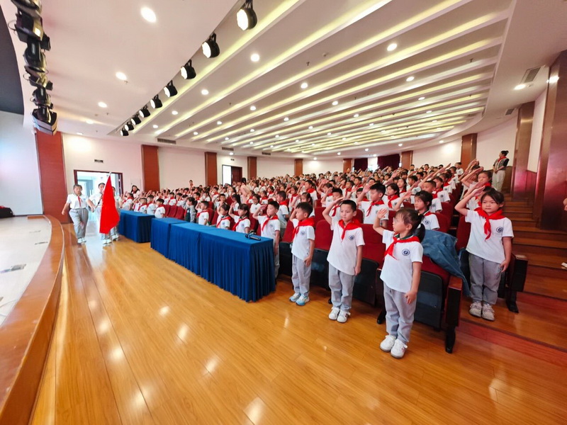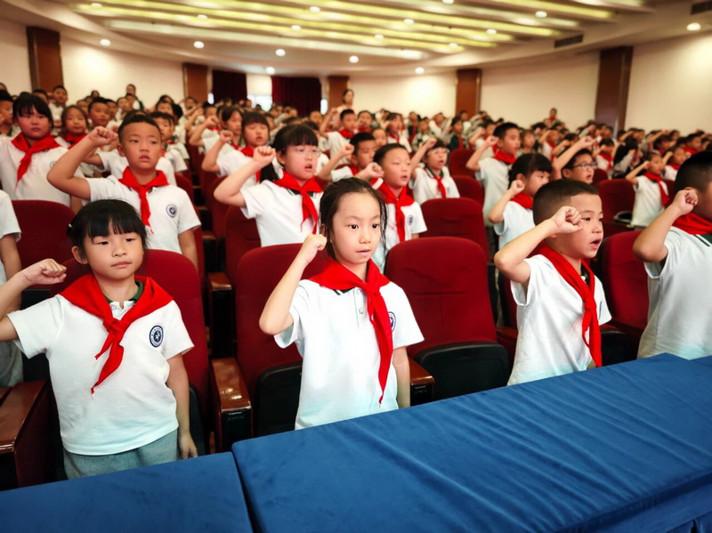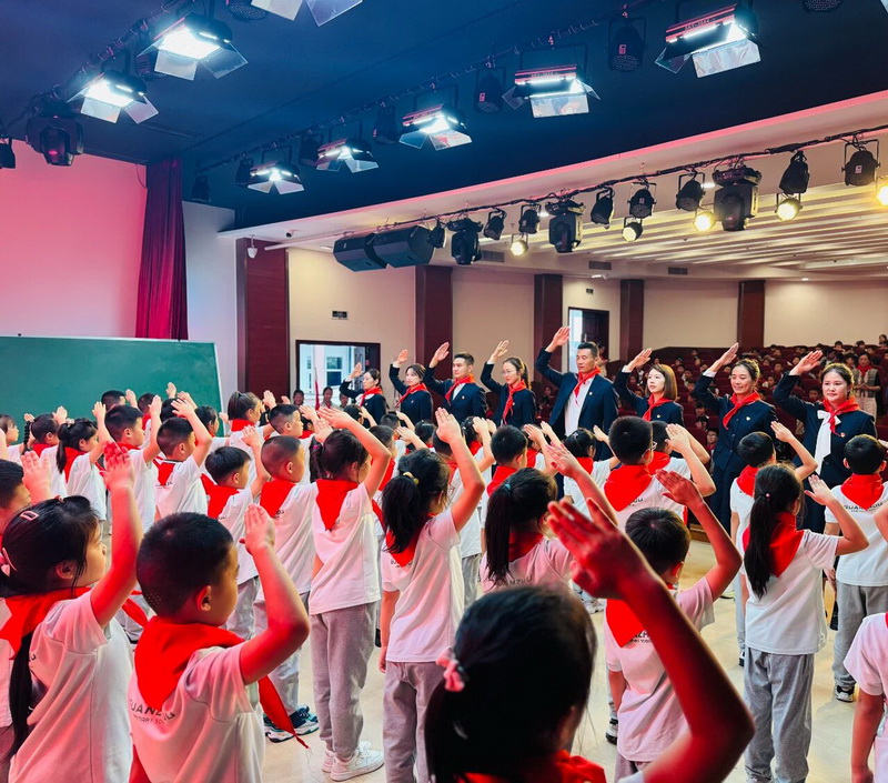 二年级103名预备队员举行入队仪式,队员们高举右拳庄严宣誓,党员老师为其佩戴红领巾。学校党支部李书老师致辞,勉励队员以红领巾为信仰,将个人梦想融入强国复兴伟业,在星星火炬指引下茁壮成长。 103 second-grade reserve team members held a joining ceremony, the team members raised their right fists and solemnly swore, and the party members and teachers wore red scarves for them.