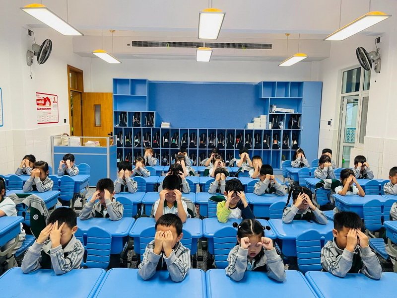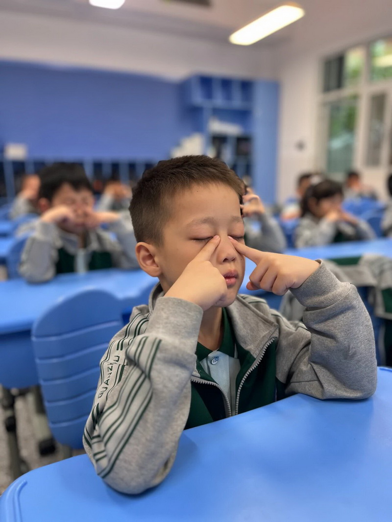 课间时分,师生伴着音乐认真做眼保健操,按揉穴位呵护双眼。During breaks, teachers and students perform eye exercises to music, massaging acupoints to protect their eyes.