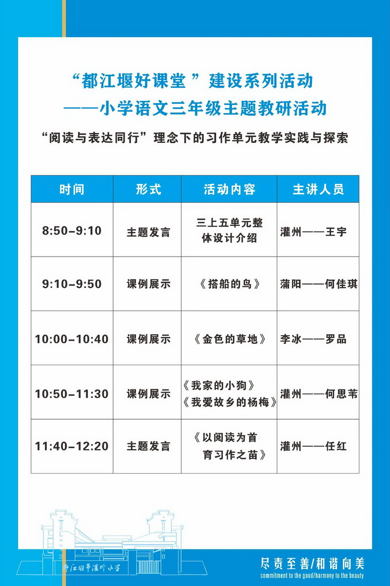 从单元架构到课堂实践,从方法探寻到理念升华,这场教研活动为“都江堰市好课堂建设系列活动”注入了鲜活力量。相信在这样的深耕细研中,老师们终将引导孩子们擦亮发现美的眼睛,以笔为犁,在“缤纷世界”里耕耘出满溢童真的习作硕果。