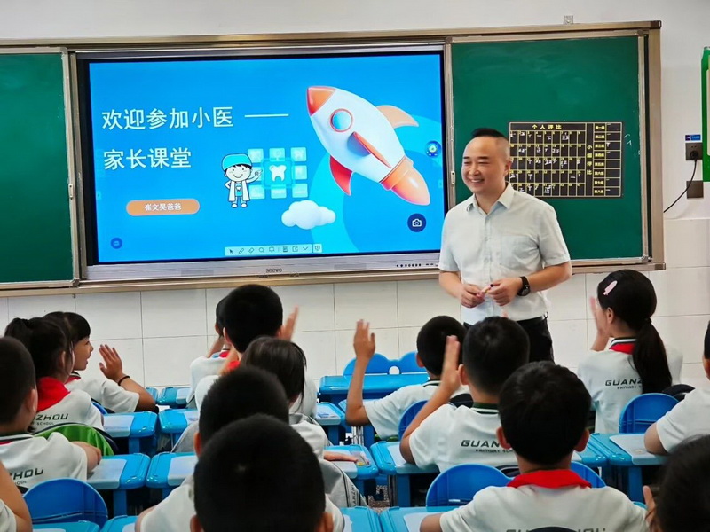 In Class5 Grade4,the father of Cui Wenha presented “a dental health”.
