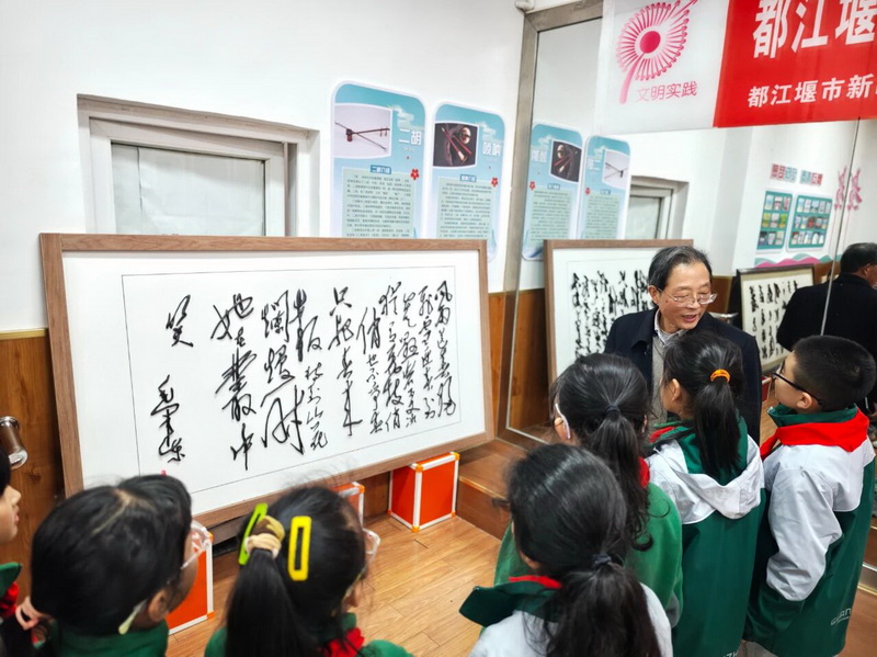 活动现场,根书创始人李明老师的作品展吸引师生驻足。李明老师不仅讲解了根书的由来、制作方法及创作灵感,还通过作品生动展现了根书艺术与本土文化、红色文化的深度融合——融入都江堰水利工程元素的作品,彰显着深厚的本土历史底蕴;而以毛主席诗词为内容的红色主题作品,则兼具自然之美与红色精神。