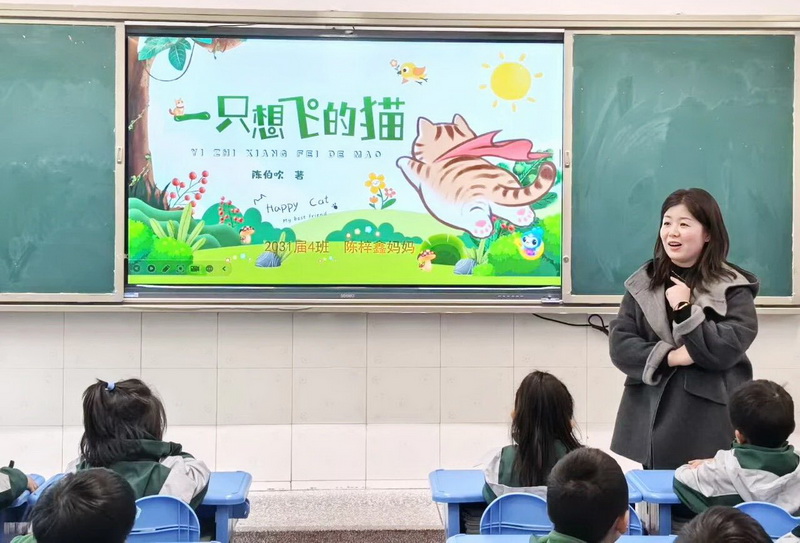 1.4班陈梓鑫妈妈特意为孩子们带来了经典儿童读物《一只想飞的猫》。分享过程中,她精心挑选书中趣味十足的经典桥段,用生动的讲述将故事里的奇妙情节娓娓道来,成功点燃了孩子们对阅读的好奇心与探索欲。