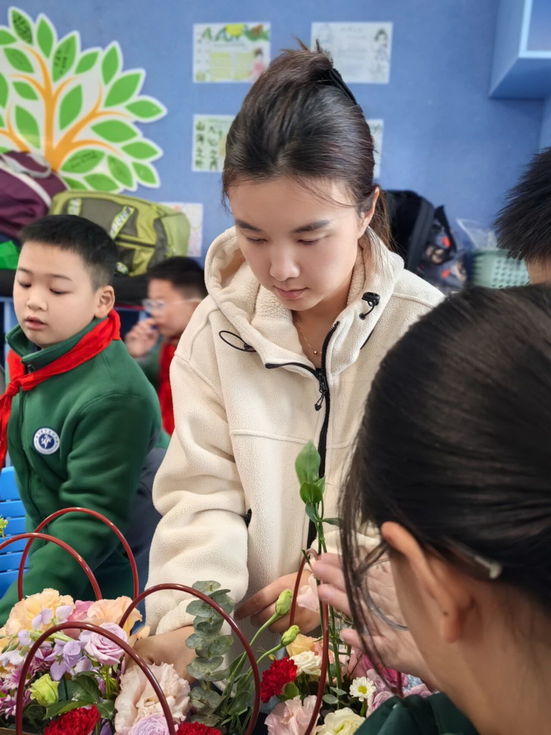 5.4班在“小小花艺师”的温柔课堂里,唐靖杰琪的妈妈带领孩子们轻触花艺的温度:知道了插花的由来与意趣,了解了花艺的错落造型,也懂得了亲手筑造花之美的巧思,让浪漫与生活的联结在心底悄悄发了芽。