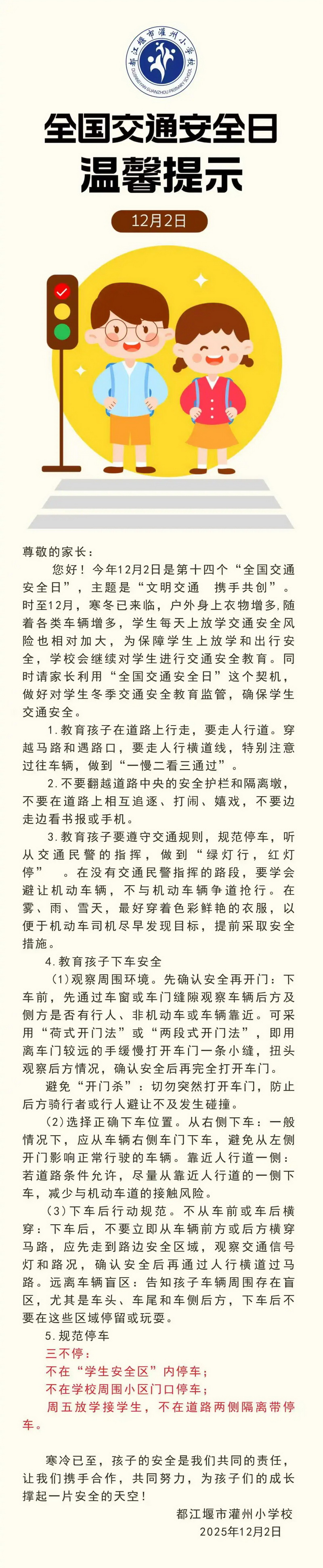 为了让家长也参与到交通安全教育中来,学校向全体家长下发了《全国交通安全日温馨提示》,倡议家长们以身作则,遵守交通规则,为孩子树立良好的榜样。同时,提醒家长在接送孩子上下学途中,要遵守交通信号灯,不逆行、不闯红灯、不随意停车,确保出行安全。