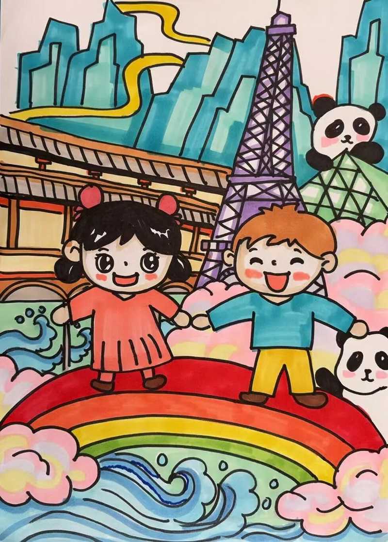 In cross-media creative activities, students showcased their talents across grades.Third graders' artwork showcased the resilient spirit and shared pursuit of a better life between Chinese and French cultures.