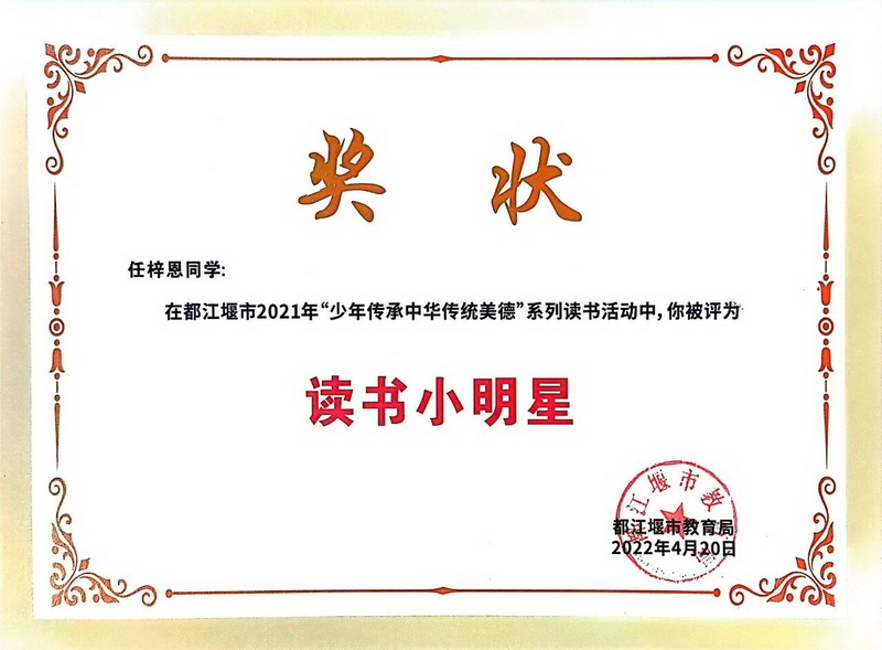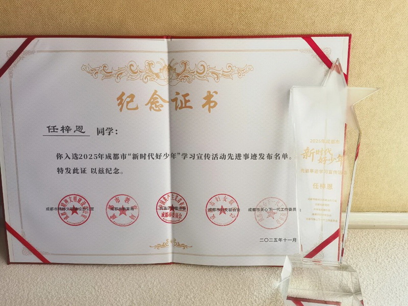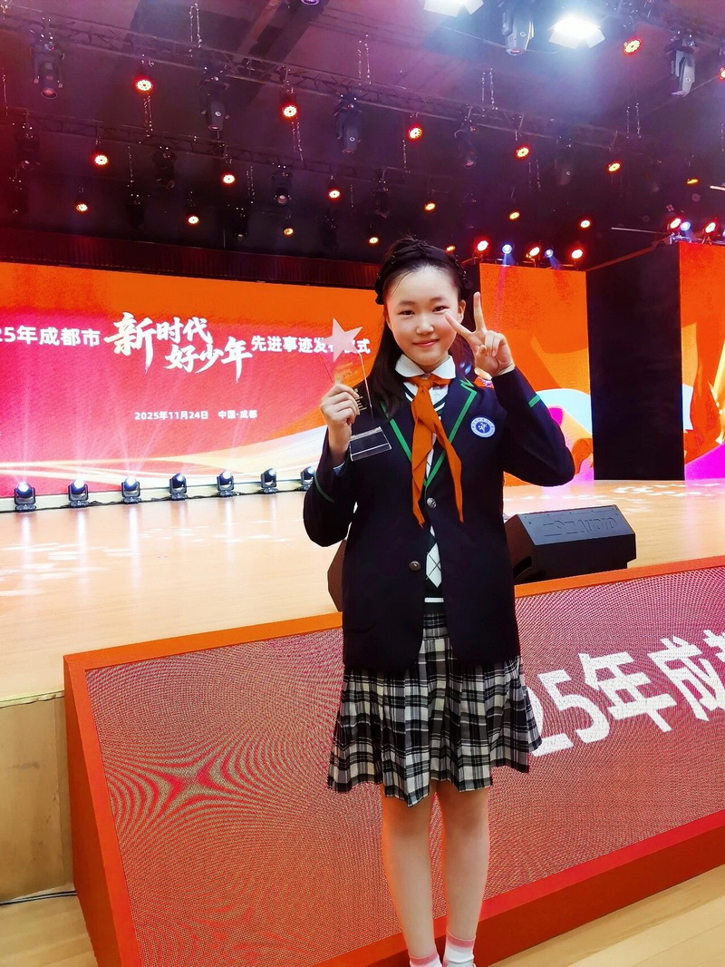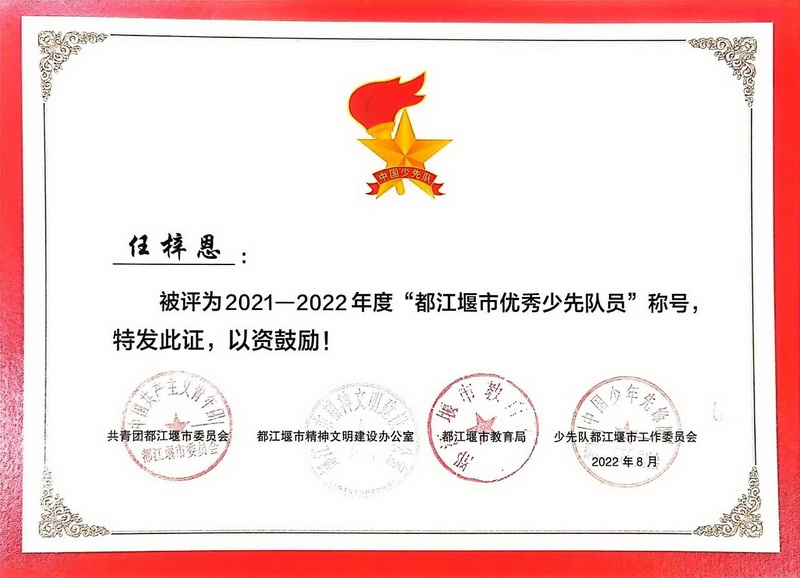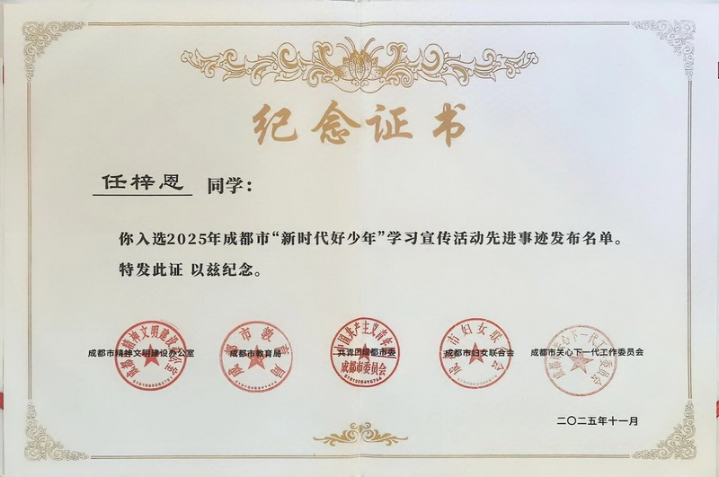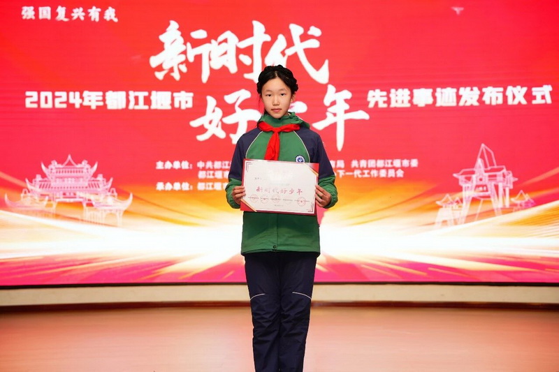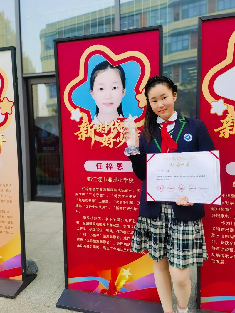 在润泽千载的都江堰旁,任梓恩正如一股清亮活泼的泉水,既有静水深流的沉稳积淀,又有奔涌向前的蓬勃力量。她以志愿服务践行奉献,以广泛才艺丰盈生命,以模范行动担当责任。她的成长轨迹告诉我们,新时代的好少年,是家园情怀的自觉守护者,是全面发展的积极追求者,更是向光而行、并能照亮他人的温暖光源。