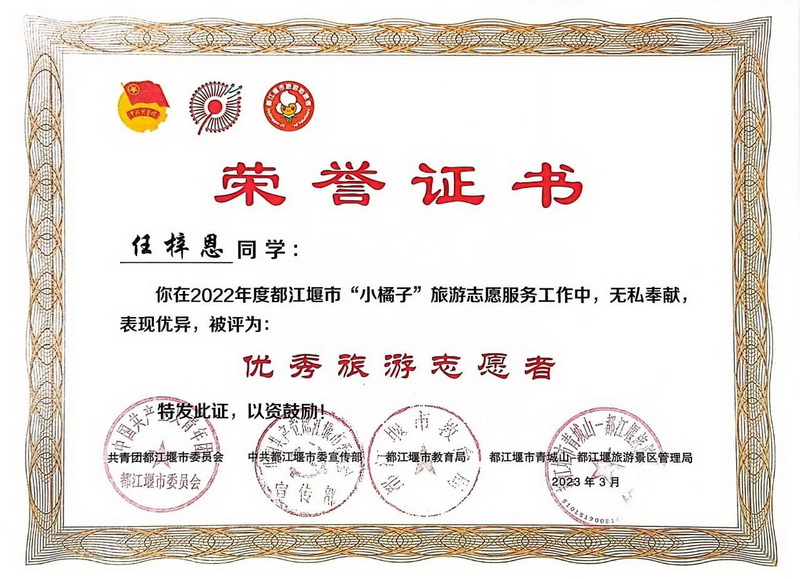让奉献成为青春最美的底色 任梓恩与志愿服务结缘,始于对家乡都江堰深深的热爱。看到八方游客对这座“三遗之城”充满赞叹,一个念头在她心中扎根:“我要为我的家乡做点什么,让每一位客人都感受到这里的友善与文明。”于是,她毅然加入了都江堰市“小橘子”旅游志愿者队伍。三年来,无论寒暑,在景区、在街头,总能看到她小小的身影,耐心解答问询、引导文明参观、捡拾零星垃圾。2022年至2024年,她连续三年获评都江堰市“优秀旅游志愿者”,2025年更荣获“小橘子最美志愿者”称号。对她而言,志愿服务不是任务,而是一种习惯,一种用行动表达对家乡深情的方式。
