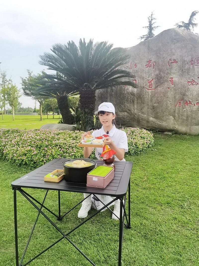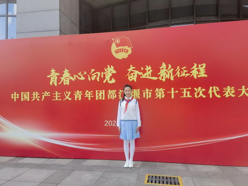 这份奉献精神从景区延伸至更广阔的舞台。作为学校“红领巾”志愿者,她积极响应少先队号召,活跃在各类社会实践和公益活动中。2024年,她有幸被选中作为全市少先队员代表,在共青团都江堰市第十五次代表大会上献词。站在庄重的会场,她目光清澈,声音坚定,一字一句诉说着新时代少先队员的理想与担当,展现了都江堰少年昂扬向上的精神风貌。