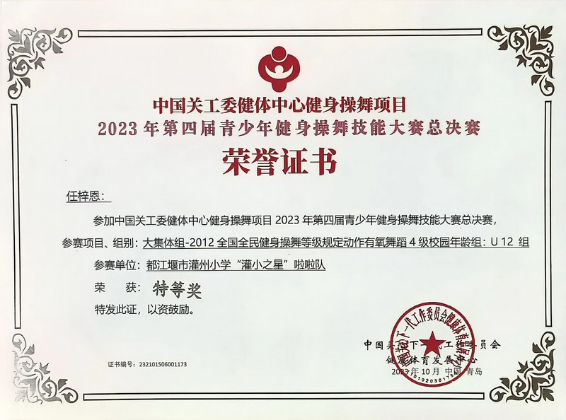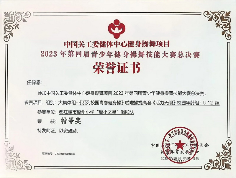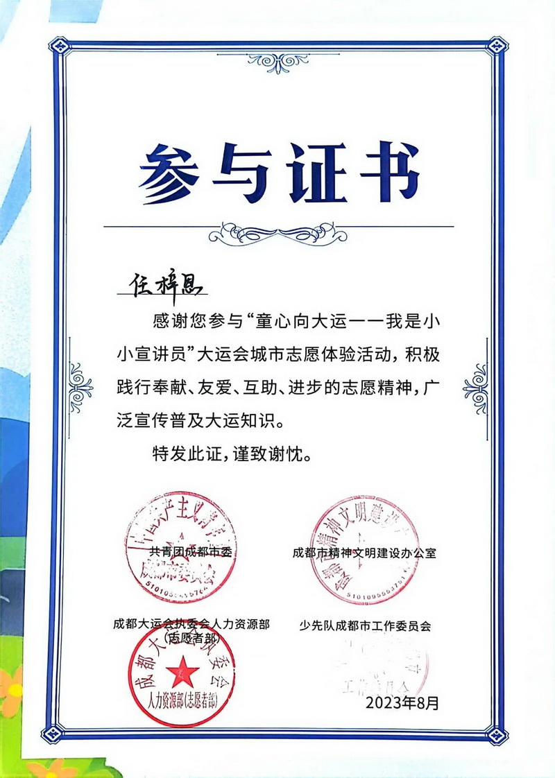 在艺术的天地里,她自如挥洒。指尖在黑白琴键上跳跃,流淌出优美旋律;画笔在宣纸画布上勾勒,描绘出多彩世界。她曾在全国少儿茶艺测评中获得五级证书,于茶香氤氲中体味东方礼仪的雅致;在“庆冬奥 迎大运”都江堰市国际友城青少年绘画比赛中荣获三等奖,用色彩搭建友谊的桥梁。她更是学校活力四射的啦啦操小将,与队友们一同拼搏,斩获全国中小学生健美啦啦操大赛冠军、成都市青少年健美操啦啦操比赛第一名等多项荣誉,用汗水和笑容诠释了团队精神与运动之美。