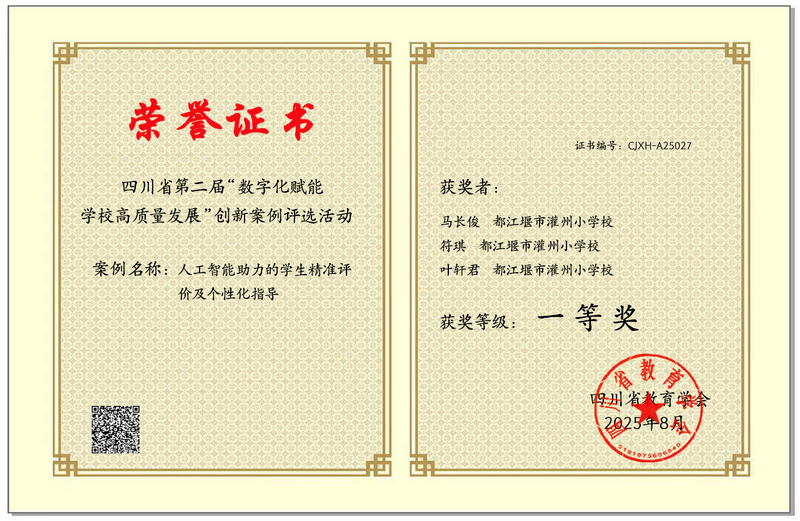 我校案例《人工智能助能学生精准评价及个性化指导》,在四川省第二届“数字化赋能学校高质量发展”评选中脱颖而出,荣获创新案例一等奖。同时,该案例对应的专题讲座,在文轩优教平台组织的2025年第二届“数字化赋能学校高质量发展”优秀案例展示活动中成功进行线上展播,向全省教育同行分享灌州小学在数字化教育领域的实践探索与创新成果。