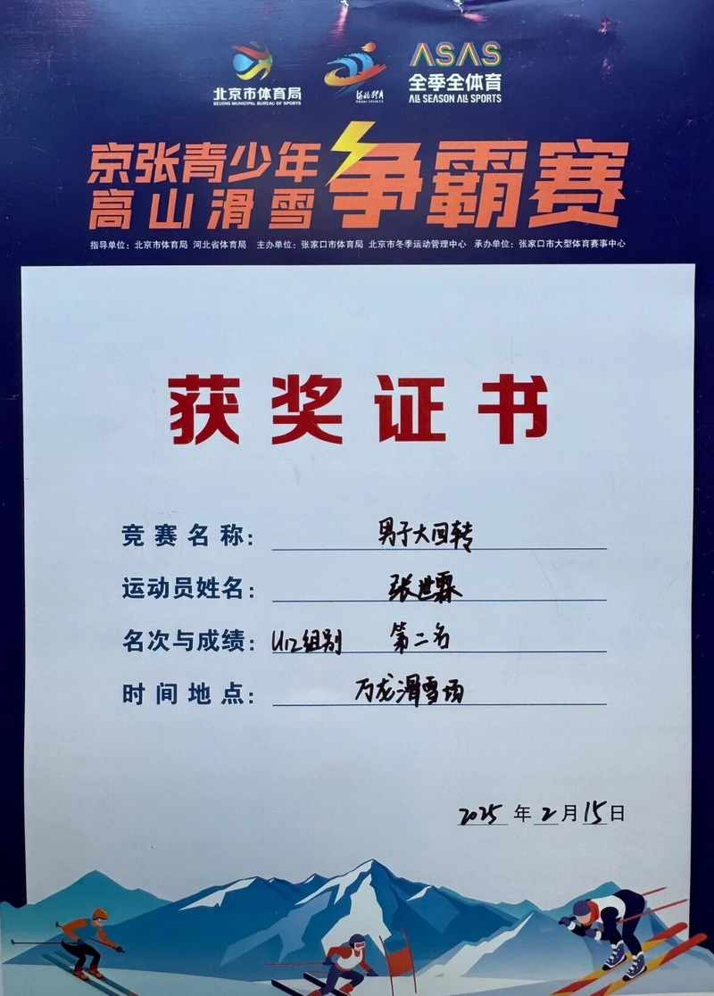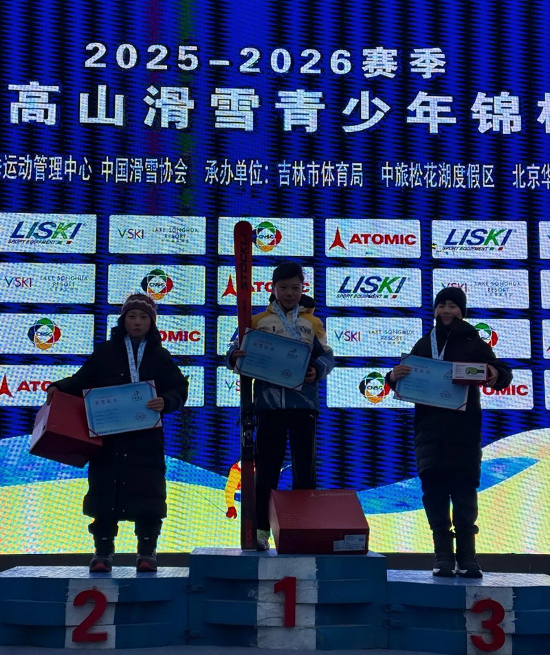 At the 2025-2026 National Alpine Skiing Youth Championships held on December 17, 2025, Zhang Shilin, a Grade 7 student of the Class of 2026 from our school, seized the gold medal in the Men’s Giant Slalom event of the Junior B Division with his exquisite skills and indomitable spirit, bringing honor to his alma mater and adding splendor to his youth.
