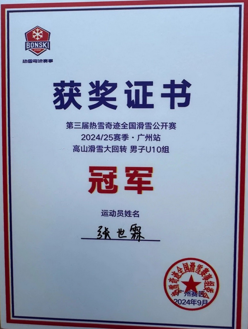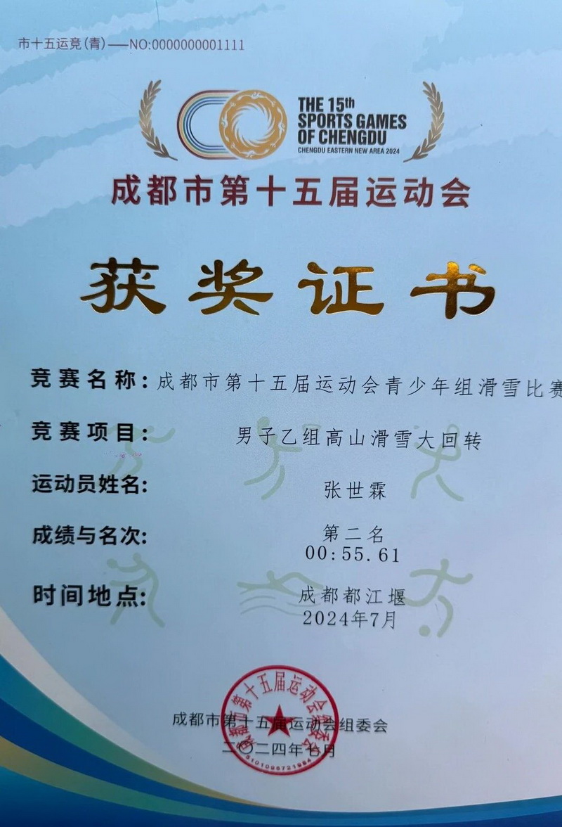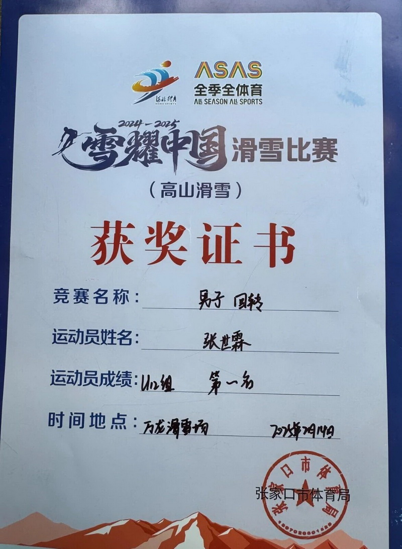 赛场上,寒风凛冽却挡不住少年的热血锋芒。面对陡峭的雪道与强劲的对手,张世霖同学沉着冷静,每一次精准过弯、每一次流畅滑行都展现出扎实的技术功底与稳定的竞技状态。从出发时的全力冲刺到中途的节奏把控,再到终点前的奋力一搏,他凭借出色的临场发挥在激烈角逐中脱颖而出,最终以绝对优势站上最高领奖台,为自己的滑雪生涯斩获一枚沉甸甸的全国冠军奖牌。