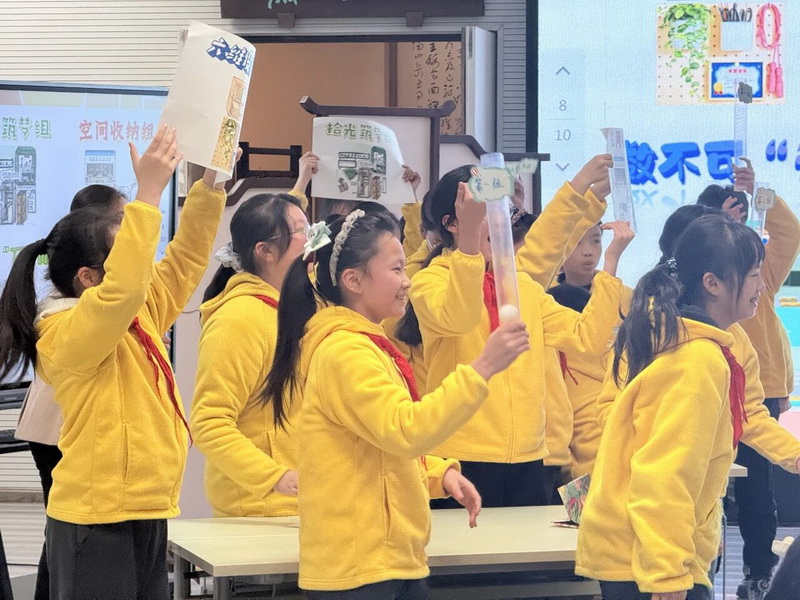 草堂小学西区分校五楼广厦草堂的两场PBL项目式学习成果汇报同样精彩纷呈。数学学科的《空间智管师:教室收纳焕新计划》,学生们围绕教室收纳的实际问题,历经“发现问题——调研分析——设计方案——方案优化”的完整项目流程,通过手绘设计图、建模展示等形式,呈现出兼具实用性与创意的教室收纳解决方案,还以拉票的形式争取老师和专家的认可,现场热闹非凡。