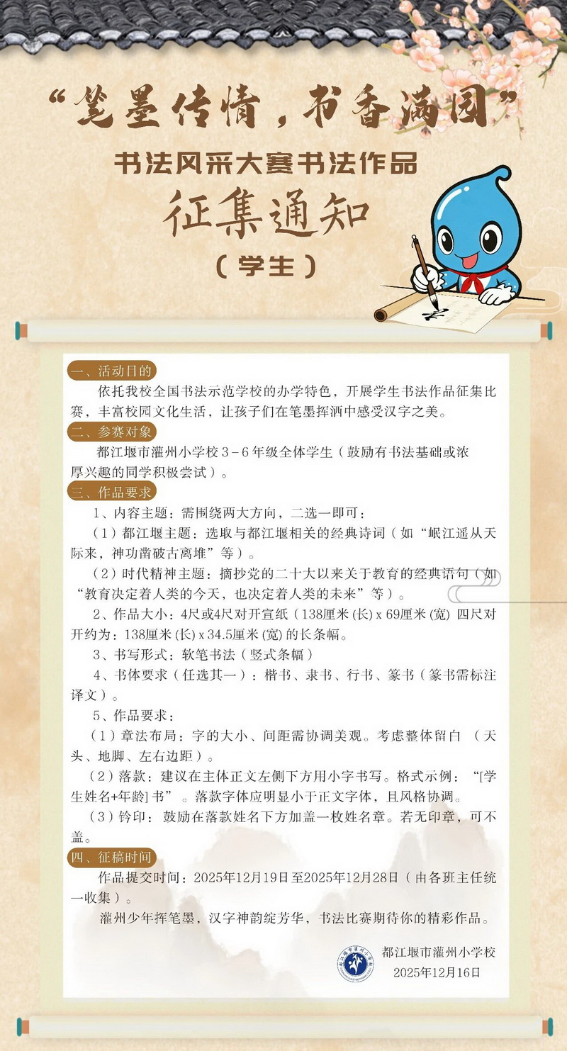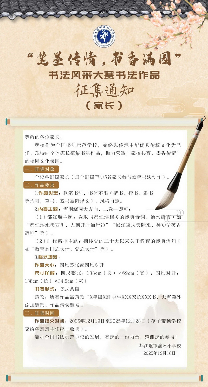 作为全国书法教育示范学校,灌州小学始终秉持“以墨育人、以文化人”的理念,深耕书法美育沃土多年。自跻身书法教育特色校行列以来,学校将书法教育深度融入日常教学,组建专业书法教师团队,开设从硬笔启蒙到软笔进阶的系统课程,定期举办书法大赛、名家进校园等丰富活动,全力营造 “人人爱书法、处处闻墨香” 的浓厚校园氛围。