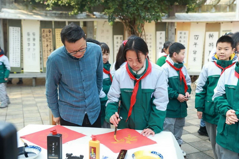 Members of the Calligraphers Association, teachers and students jointly wielded brushes to create calligraphy, with red paper spread out and ink fragrance wafting.