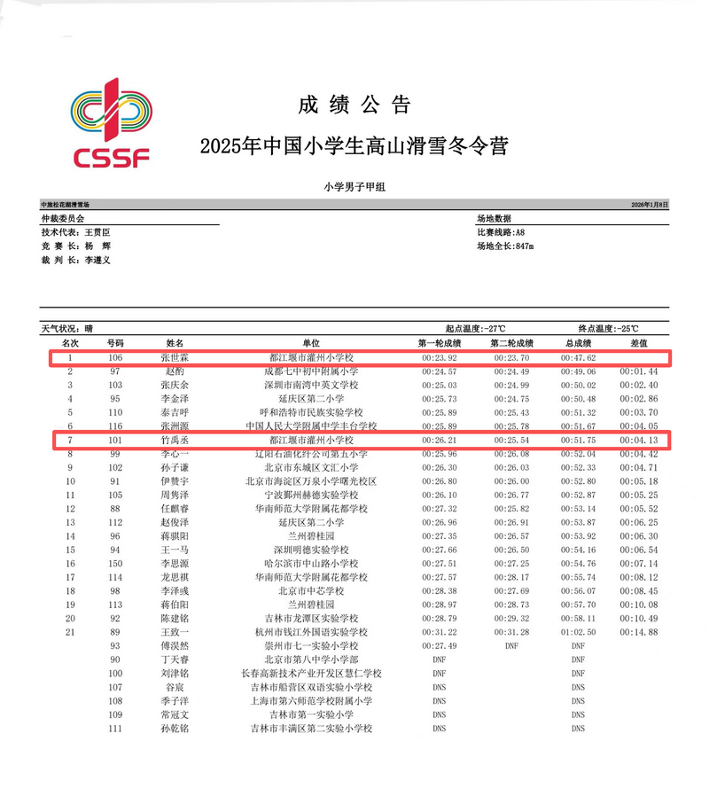 Warm congratulations to our students Zhang Shilin and Zhu Yucheng for their outstanding performance in the Primary School Boys' Group A competition of the 2025 China Primary School Alpine Skiing Winter Camp!