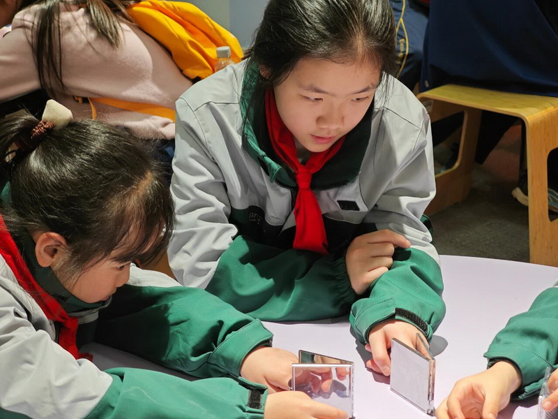 最令人期待的,莫过于动手制作万花筒环节。在工作人员的指导下,小使者们分工协作、动手操作,将彩色碎片、镜片等材料精心组合,一步步完成属于自己的万花筒。当转动万花筒,看到里面变幻无穷的绚丽图案时,孩子们脸上洋溢着满满的成就感与幸福感。这场动手实践,不仅让小使者们体验了制作的乐趣,更在潜移默化中了解了光学的简单原理,激发了大家动手探究科技的兴趣。