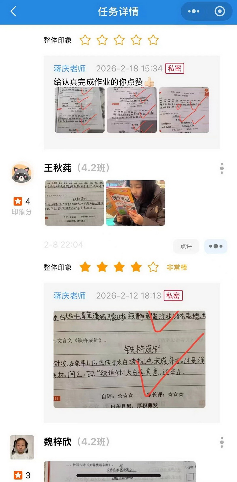 以往假期里,孩子作业无人指导、学习状态难掌握、问题反馈不及时,是不少家长的烦心事。灌州小学此次寒假线上作业批改服务,直击家长育儿痛点:家长通过平台实时查看孩子作业提交情况、教师批改点评与学习建议,清晰、全面掌握孩子假期学习进度与薄弱环节,彻底告别 “假期学习监管盲区”,无需再为辅导作业、督促学习焦虑发愁,切实减轻了假期家庭教育的精力与心理负担。高效、透明的线上沟通模式,让家长真切感受到学校用心、贴心的育人服务,收获满满认可与好评。