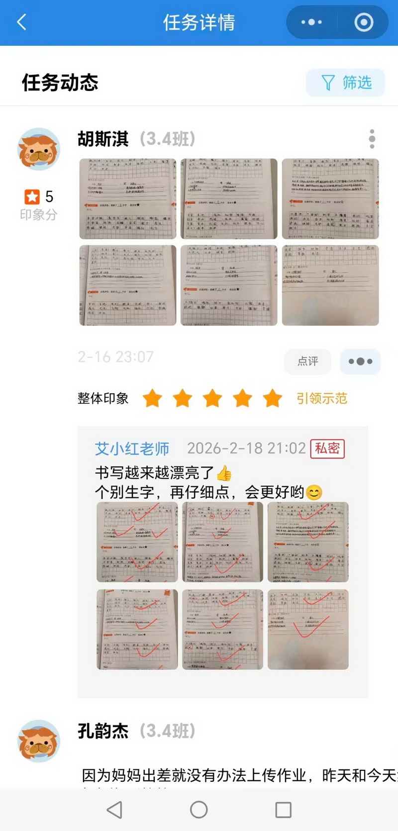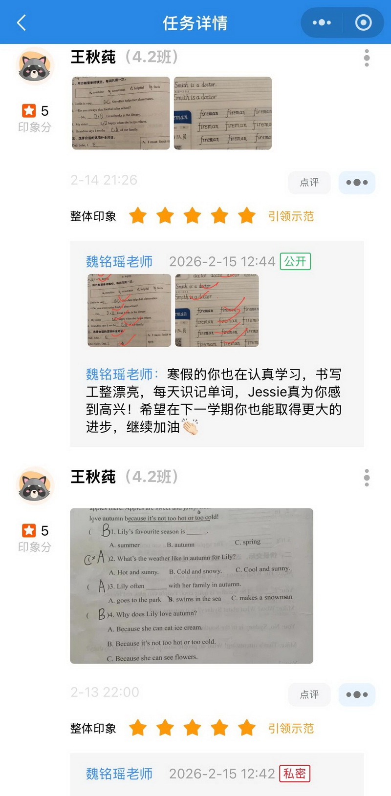 对学生而言,线上批改让寒假学习有方向、有指导、有温度。教师针对每份作业开展细致圈改、精准纠错、过程指导与暖心点评,及时纠正学习问题、肯定学习亮点,让孩子在假期里也能得到专业陪伴与实时引导,有效保持良好学习习惯,避免自主学习松懈、问题积累等情况,在稳步提升中筑牢学习基础,让假期学习更高效、更有收获。