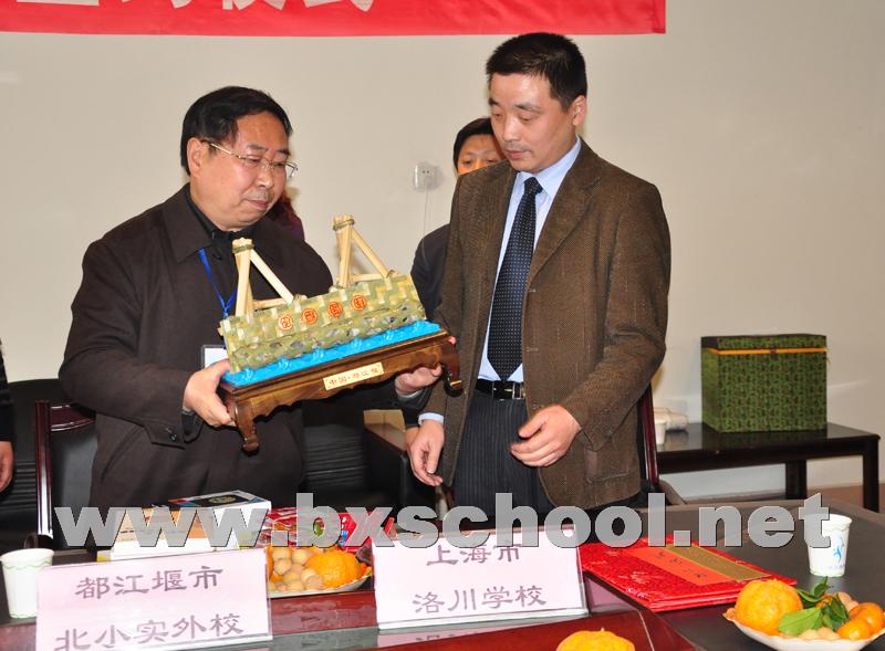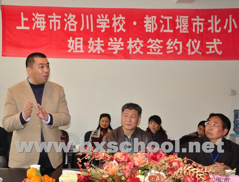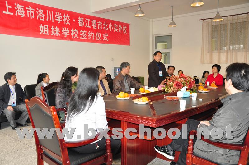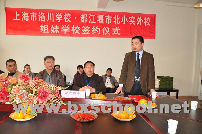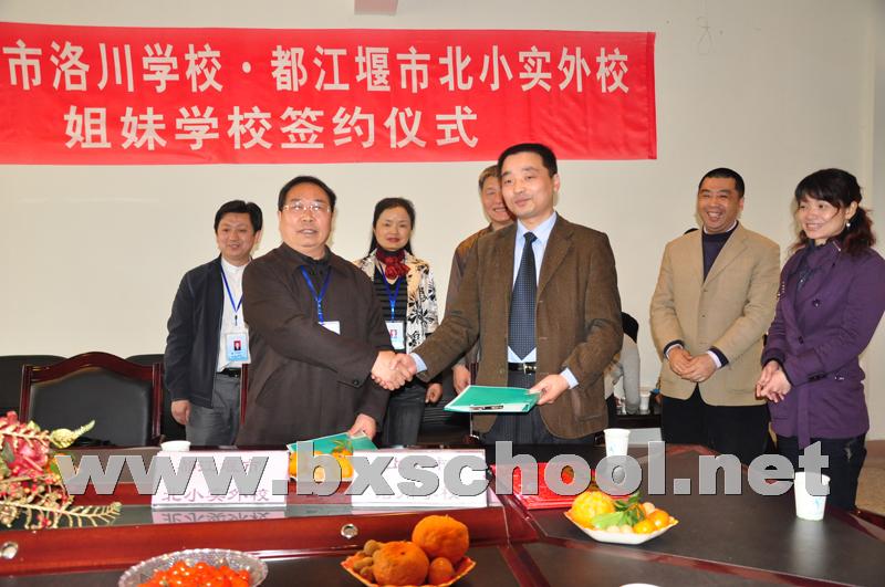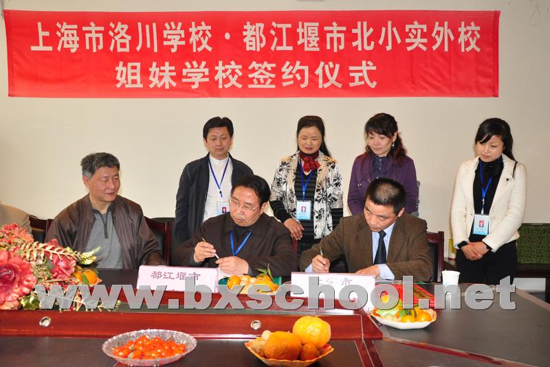 为学习上海市优秀的教育教学经验,加强上海市与都江堰的教育交流与合作,促进灾区教育事业的有效重建,本着平等自愿,合作互赢,共同发展的原则,我校与上海市普陀区洛川学校结为友好姐妹学校。 四月十六日,来自上海普陀区的教育领导团来到我校指导工作。在来自上海普陀区洛川学校到我校支教沈莉老师热心的组织,在支教大组长薛留根院长的支持下,我校老师与来自上海支教的19位老师签订了“泸都教育,携手共进”结对协议书,以师徒结对的方式。六月沈莉老师即将离开回到上海,为了将这份情谊延续下去,我校与上海普陀区洛川学校缔结为姊妹学校,在签订协议仪式上,我校夏校长致欢迎辞,欢迎远道而来的客人,感谢上海人民对灾区教育重建的大力支持;上海市普陀区教育局丁书记也发表了讲话,赞扬了我市教育重建的巨大进步。来自上海洛川学校的陈校长也发表了热情洋溢的讲话,表达了对我校的关心与支持。陈校长代表洛川学校与我校签订了友好姐妹学校的协议,我校夏校长与洛川学校陈校长互赠了礼品。教育局领导吴科长出席了本次活动。