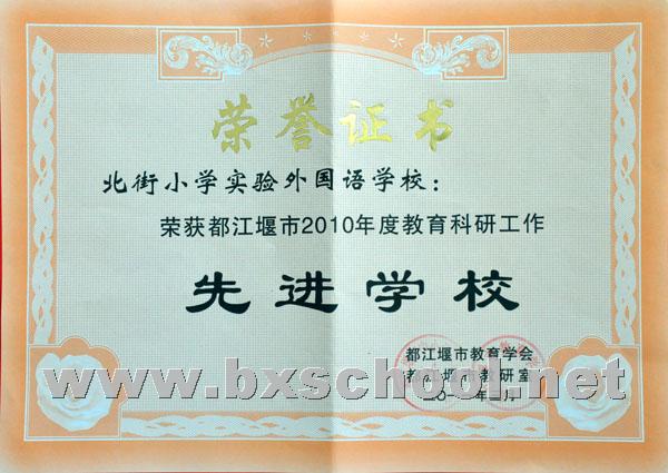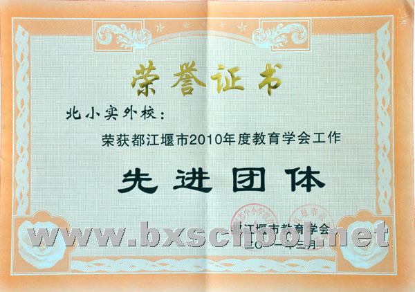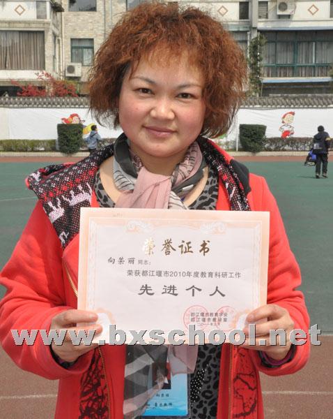 3月15日,在都江堰市教育学会2010年度总结暨2011年度工作安排会议上,因我校教育研究不仅是教师们在校园中除了教育教学活动之外的另一种生活常态,并且积极性高、创造性强,而被评为都江堰市教育科研先进单位和教育学会工作先进团体。同时,在会上还授予我校向荣丽老师“都江堰市教育科研先进个人”荣誉称号和授予江建平老师“都江堰市教育学会工作先进个人”荣誉称号。