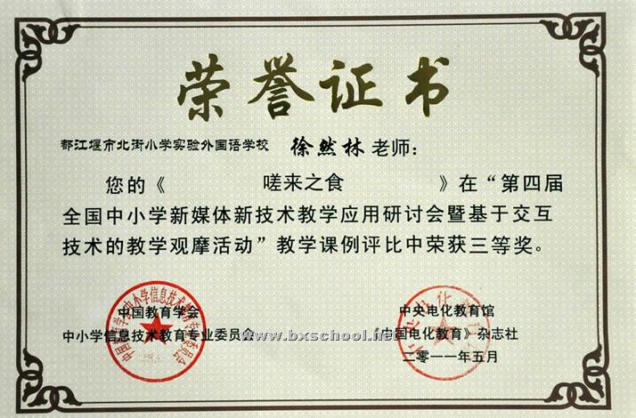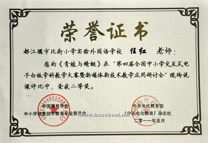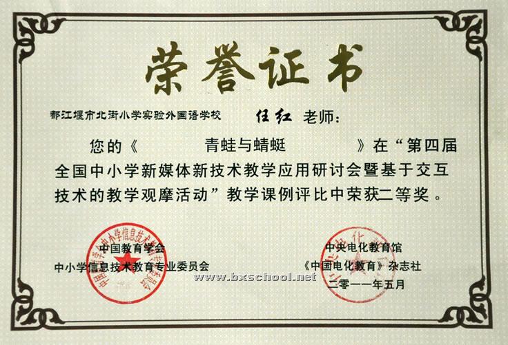 2011年5月28日,我校任红老师参加了第四届全国中小学交互式电子白板学科教学大赛,任红老师的教学课例《青蛙与蜻蜓》在“第四届全国中小学新媒体新技术教学应用研讨会暨基于交互技术的教学观摩活动”教学评比中荣获二等奖。徐然林老师的《嗟来之食》荣获三等奖。在现场说课评比中,任红老师的《青蛙与蜻蜓》荣获二等奖。