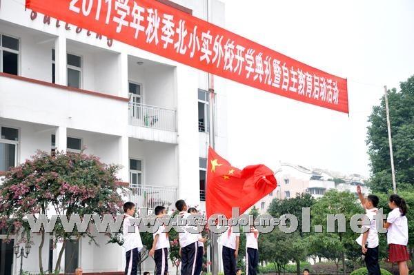 阳光灿烂的金秋九月,我们又迎来了新学期。2011年9月1日上午8:10开学典礼在学校操场上隆重举行,本次开学典礼以倡导自主教育为主题。主持人响亮的宣布声中,北小实外全体师生在庄严的升旗仪式中开始新学期的第一次集会。夏校长代表学校向全体教职工致以亲切的问候,并为同学们送上了新学期寄语,希望同学们勤奋学习,珍惜时光,养成好习惯,校长的谆谆教诲和亲切勉励让同学们倍感亲切。接着,开始本期开学典礼主题活动:大队委向全校少先队员发出争做“自觉、自主、自理、自信、自强”的倡议,希望全体同学自我觉醒,自主管理,学会自理,阳光自信,自我设计,不断总结。