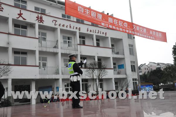 春寒料峭,细雨绵绵。然而,从新学期的第一天,学校的教育教学秩序就步入正轨。 2月10日,是我校新学期的第一次集会,全校师生已经在庄严的国旗下相聚;同时,我校还迎来了都江堰市公安局、交警队和电视台的叔叔阿姨们,在师生们的热烈掌声中,北小实外2012春季开学典礼暨“自主管理,文明交通”主题教育活动隆重举行。 仪式上,学校向全体师生发出倡议,我们将从现在做起、从小事做起,自觉遵守交通法规,做到文明出行,用实际行动做文明交通的倡导者、传播者和践行者。同时,都江堰市交警大队交警叔叔还向全校师生讲解了交通安全知识,并教给师生们基本的交通手势,希望师生们能带动家庭积极参与到文明交通活动中来,营造整个社会的文明交通环境。 最后,我校大队委代表卢江睛、张浩凌、刘可贝同学,向全体同学提出三点学习建议,希望同学们在学校里做到“三个jìng”: 遇到师长要尊敬;学习活动要安静;生活环境要干净。“四个一”: 一进校园就学习;一见纸屑就捡起;一听铃声就安静;一见老师就问好。并且她们还带来了自编自导的快板表演《北小实外自主成长新公约》,呼吁同学们一起努力,和北小实外共成长!。活动结束后,各班结合活动进行了开学第一课主题班会教育。