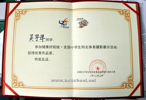 以"健康、运动、阳光、未来"为口号,吸引广大小学生拿起相机,走向操场、走进大自然阳光下,记录下学校里、班级中同学们积极参加体育锻炼的瞬间。 信息组的老师在学校各位领导和老师的支持下,积极组织学生参加了这一次的摄影比赛,我校上交的部分作品经过网络投票和专家的初审顺利进入到前200名,顺利进入到网上投票展示期,最后由阳光体育办公室邀请活动聘请的国内著名摄影家对作品进行终审,结合网络投票结果最终评出各种奖项(一等奖10名,二等奖20名,三等奖30名和优秀奖100名。)我校学生的两幅作品在90多万张作品中脱颖而出,获得了一个二等奖和一个优秀获,我们的学校同时也获得了一个优秀组织获。