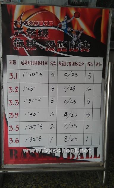 2013年3月14日这天对于北小实外三年级的所有孩子来说,就像是过节一样,因为今天我校一年一度的篮球活动轮到了三年级组的运球技巧和投篮比赛。 赛前各班已经经过了层层选拔,最终每个班由五名篮球能手代表参赛,可别小看这些才三年级的小学生,他们在运球技巧赛上身手灵动,健步如飞,人和球结合起来依然可以快速通过障碍物。投篮赛上三年级五班的蔡婧旸同学成为了众人关注的焦点,这个女孩子投篮动作规范,命中率极高,在众多“粉丝”的簇拥和加油呐喊声中,五次出手只失一球,对于很多投篮连球框都碰不到的同学来说,无不发出感叹之声,眼里流露出无比的崇拜和羡慕之情!要知道刚刚结束的运球技巧赛里她的个人用时可是最短的!最终通过各班五名参赛运动员的通力协作,团体成绩决出胜负。在运球技巧赛中3.6、3.5、3.2为班级争得了荣誉,投篮比赛的最终结果是3.6、3.5、3.4分别夺得前三名!